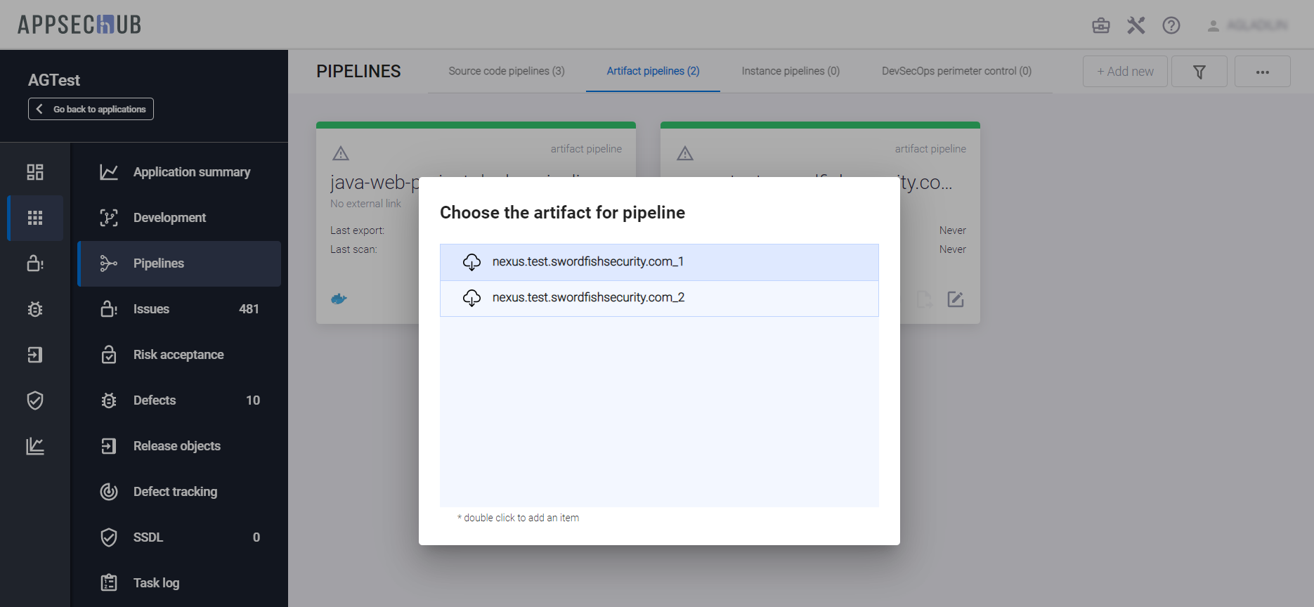 В системе не должно существовать пайплайнов с одинаковым набором артефактов. Если в системе уже существует пайплайн с некотором набором артефатов, то создать второй такой же пайплайн не удастся. AppSec.Hub отслеживает уникальность каждого пайплайна с несколькими артефактами. Артефакты, выбор которых мог бы привести к созданию «не уникального» пайплайна, повторяющего уже существующий в системе пайплайн, просто не отображаются в окне Add artifact.