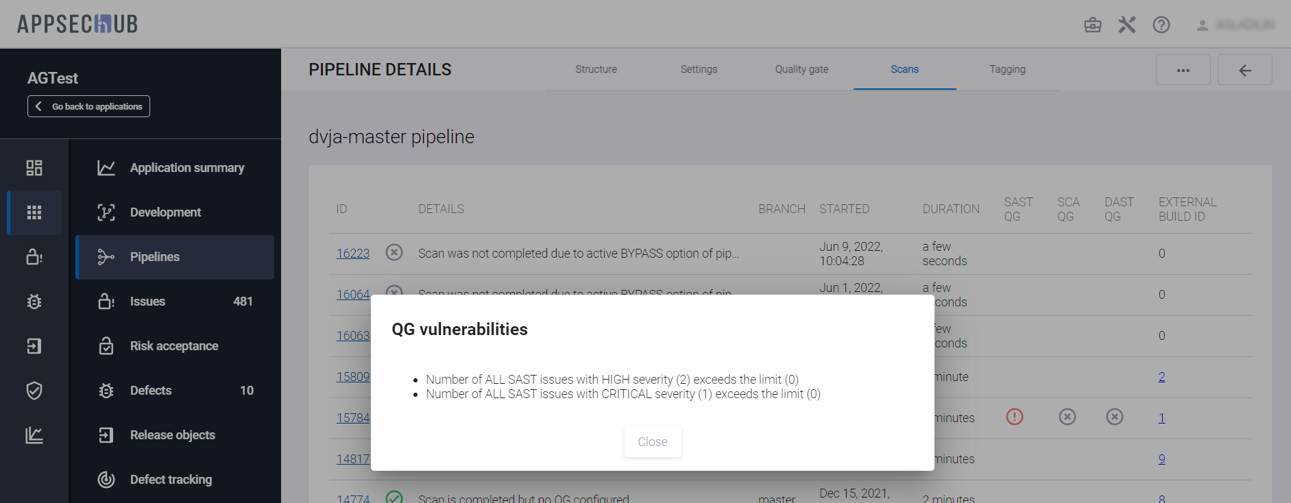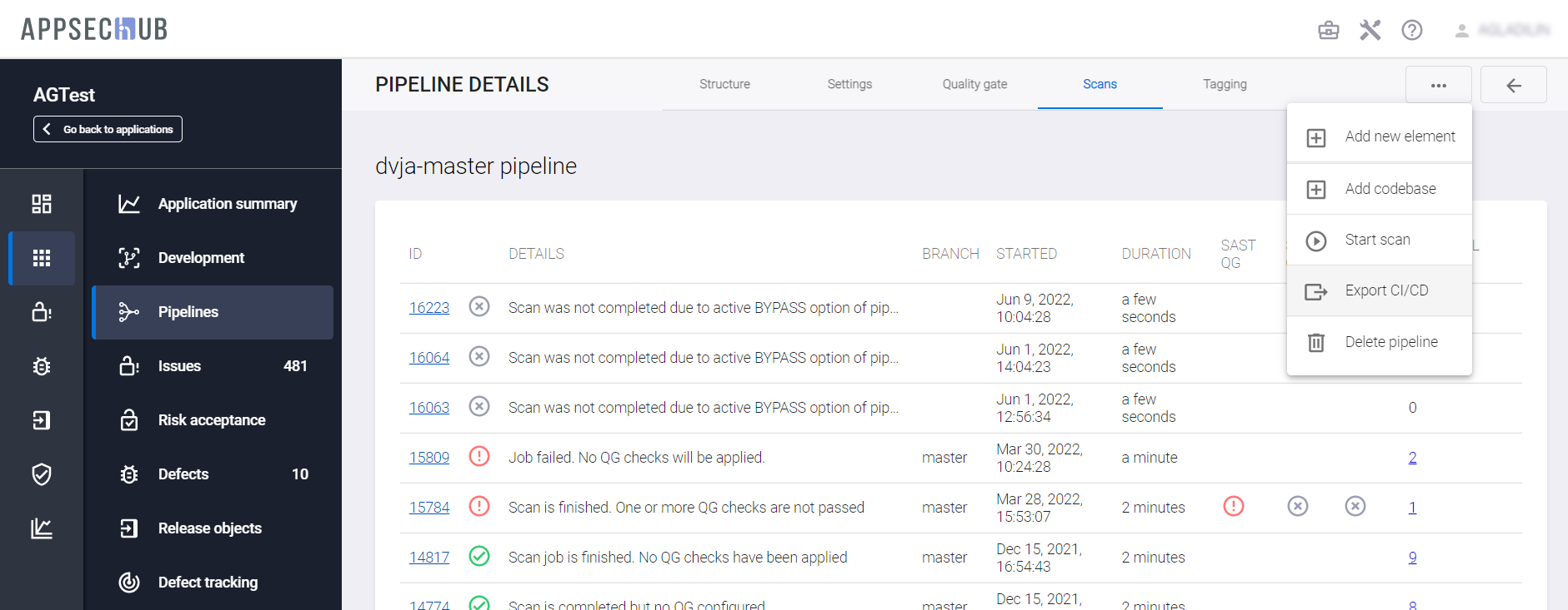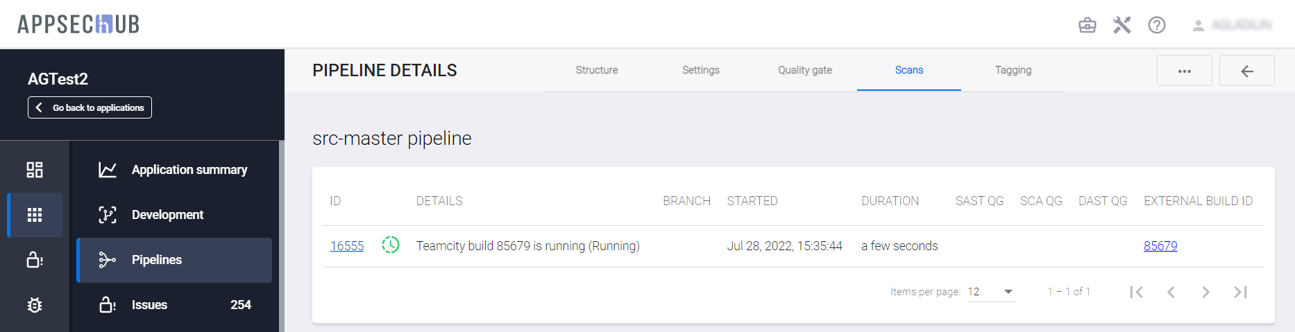 Выберите вкладку Scans, чтобы получить подробную информацию о результатах сканирования для выбранного Security Pipeline.