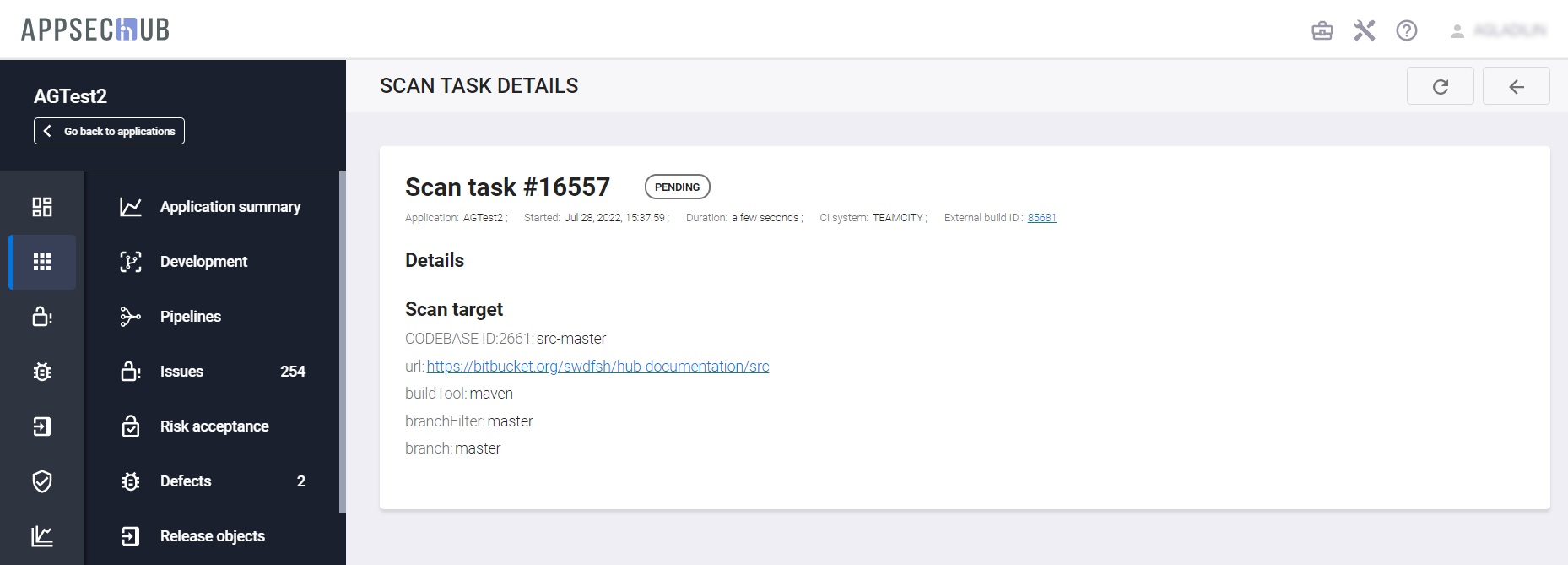 ID выполненного сканирования в AppSec.Hub. Чтобы ознакомиться с подробной информацией о сканировании, нажмите значение в данном столбце. Отобразится следующая страница.