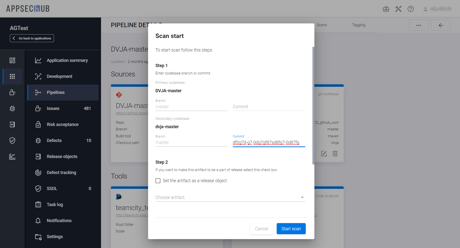 AppSec.Hub предоставляет возможность запуска тестирования безопасности нажатием кнопки Start scan