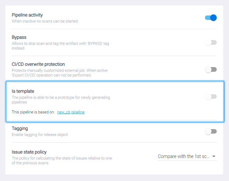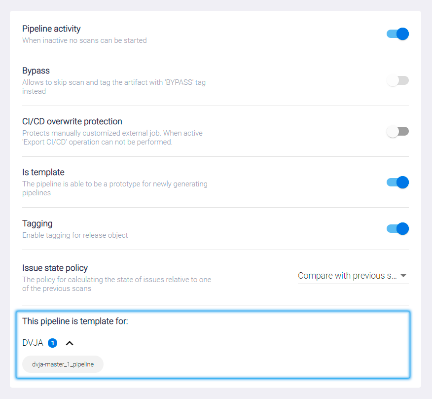 Is template — этот переключатель активирует функциональность, которая позволяет использовать Security Pipeline в качестве шаблона при создании новых. На карточке появляется значок This is a template pipeline