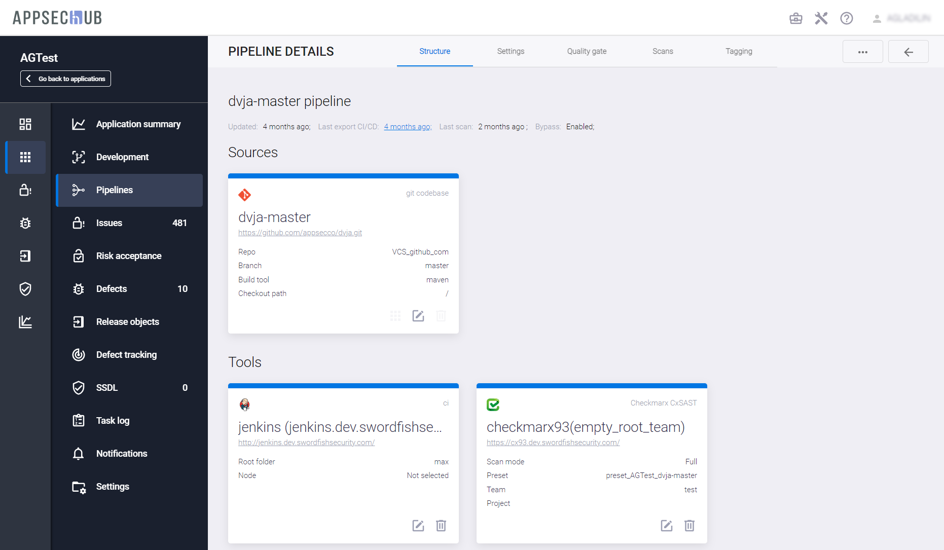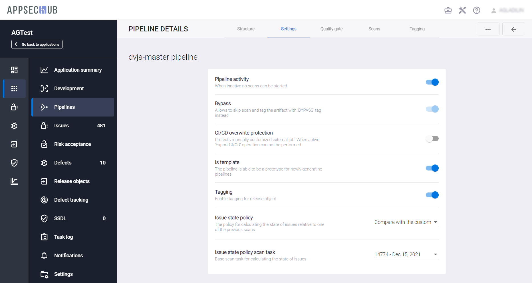 - Pipeline activity — если этот переключатель выключен, Security Pipeline не может быть запущена на сканирование. Состояние этой настройки пайплайна в AppSec.Hub отображается с помощью цвета линии вверху карточки пайплайна. Если линия имеет серый цвет, переключатель выключен, Security Pipeline не может быть запущена на сканирование. Если линия имеет зеленый цвет, переключатель выключен, Security Pipeline может быть запущена на сканирование.