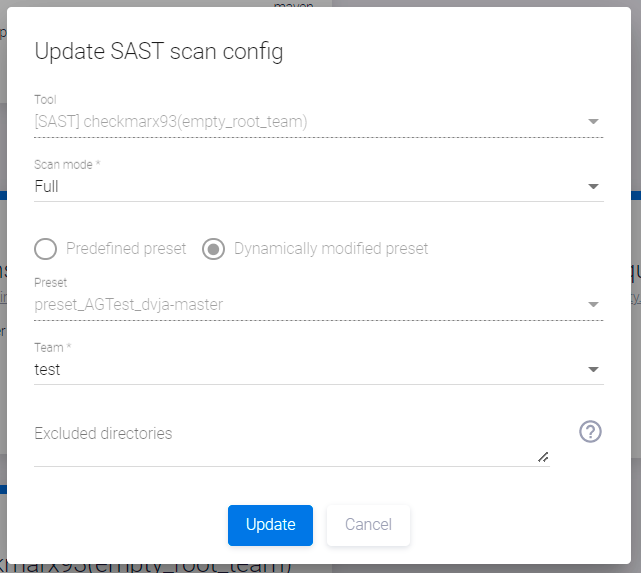 в правом нижнем углу карточки Checkmarx. Появится окно Update SAST scan config.