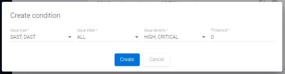 Рассмотрим пример использования Quality Gate в Security Pipeline. Предположим, для выпуска релиза приложения определены следующие критерии: отсутствие любых уязвимостей высокой и критической степени серьезности (high/critical severity issues), выявленных инструментами SAST и DAST. Чтобы создать Quality Gate с такими критериями, при настройке профиля Quality Gate (см. раздел «Quality Gates» Руководства администратора) выберем следующие параметры.