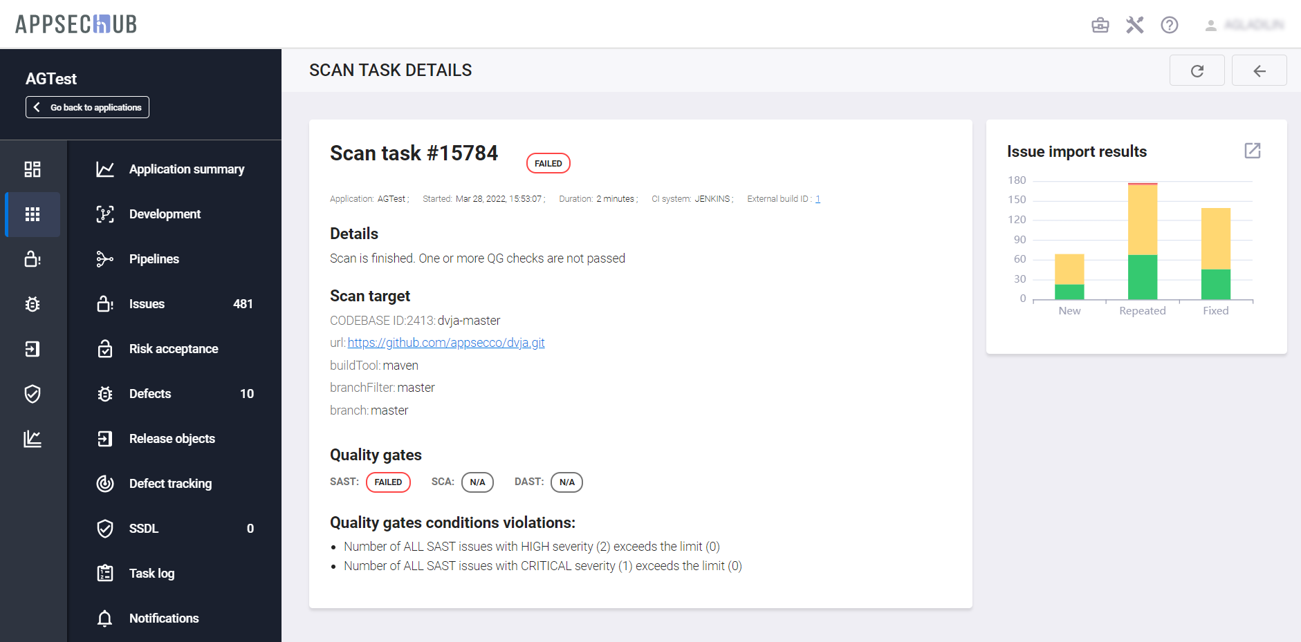 - Issue import results — результат импорта security issues в виде диаграммы с распределением по статусам (New, Repeated, Fixed). Рядом с диаграммой располагается иконка, нажав которую можно перейти к перечню security issues, обнаруженных в ходе данного сканирования. Предусмотрена возможность обновления данных на странице (кнопка Refresh data).