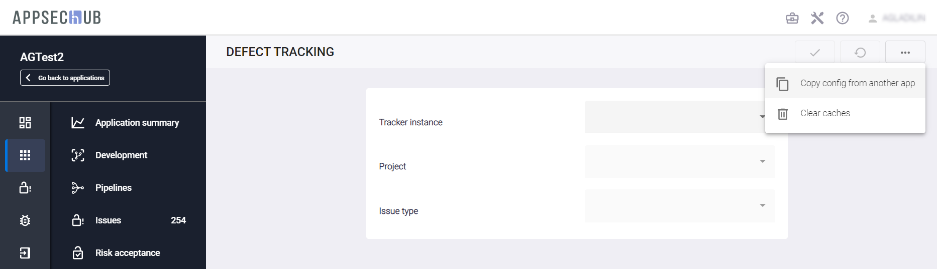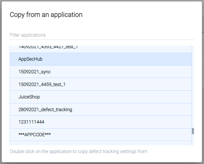 В системе существует возможность просто скопировать все настройки отслеживания дефектов в AppSec.Hub из другого приложения. Для этого на появившейся странице Defect Tracking нажмите кнопку Actions в правом верхнем углу, выберите пункт выпадающего меню Copy config from another app и выберите из выпадающего списка приложение, из которого будут скопированы настройки.