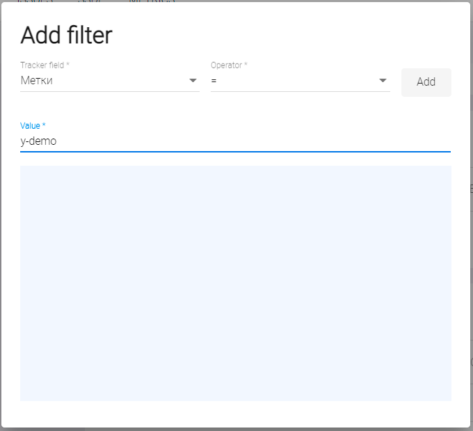 Предположим, что все дефекты безопасности в Jira были помечены меткой y-demo. В таком случае необходимо выбрать значение Labels в выпадающем меню Tracker field, значение = в выпадающем меню Operator, ввести значение y-demo в поле Value и нажать кнопку Add справа. Вновь созданный фильтр появится в окне Add filter.