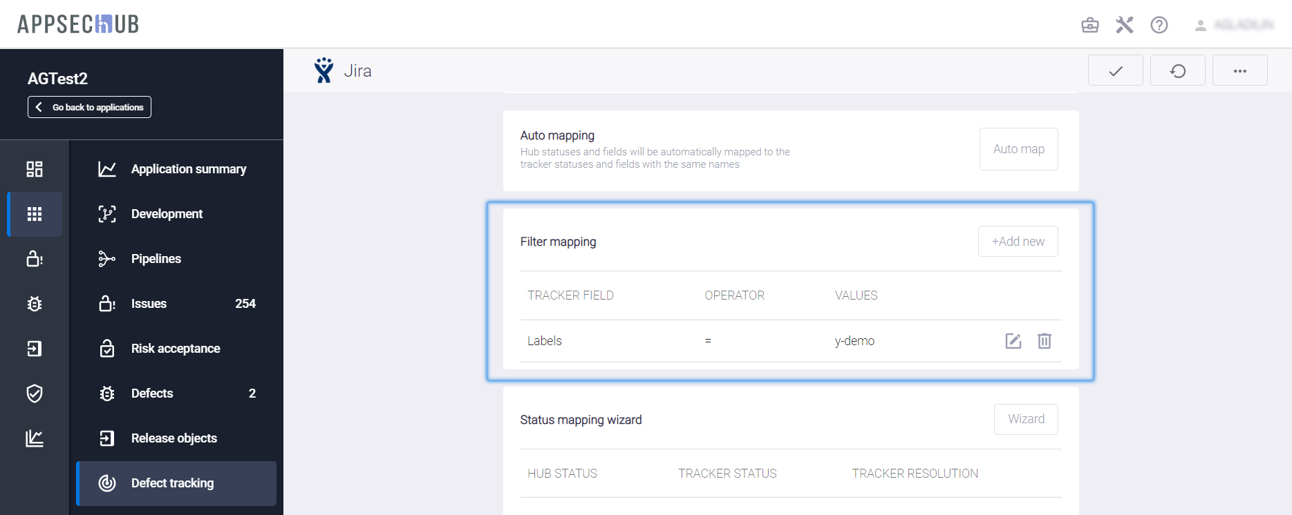 Нажмите кнопку +Add new в секции Filter mapping на странице Defect Tracking.