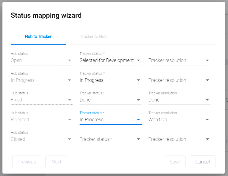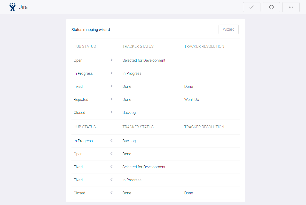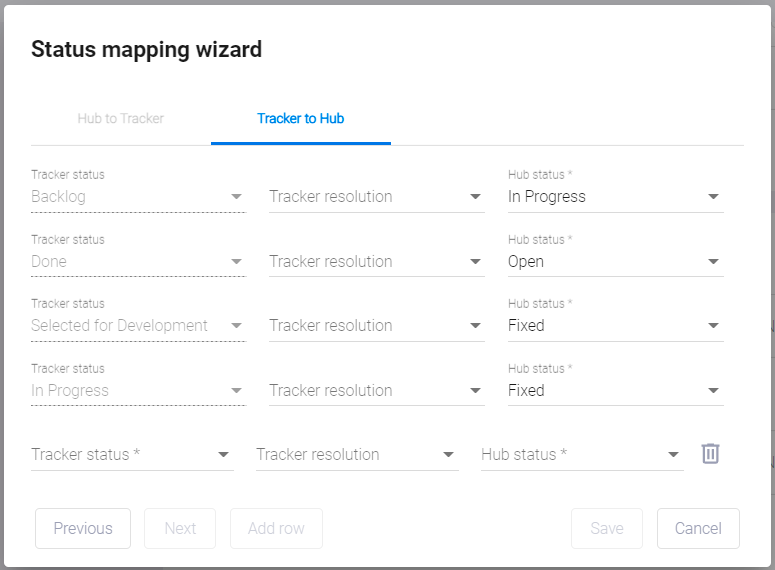 При появлении в системе отслеживания задач нового статуса можно добавить его в таблицу сопоставления статусов, нажав кнопку Add row. Выполнив все необходимые настройки, нажмите кнопку Save. Перечень всех сопоставленных статусов появится в разделе Status mapping wizard. При необходимости можно запустить мастер настройки вновь и повторить сопоставление статусов.