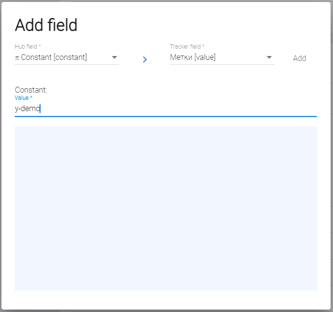 Перед каждой синхронизацией дефектов с Jira необходимо последовательно соблюдать соответствие установленному фильтру и проставлять на все новые дефекты безопасности в AppSec.Hub метку y-demo. Такое действие может быть автоматически задано в настройках в разделе Field mapping на странице Defect Tracking. Нажмите кнопку +Add new и выберите значение Constant в выпадающем меню Hub field, значение Labels [value] в выпадающем меню Tracker field, введите значение y-demo в поле Constant и нажмите кнопку Add справа.