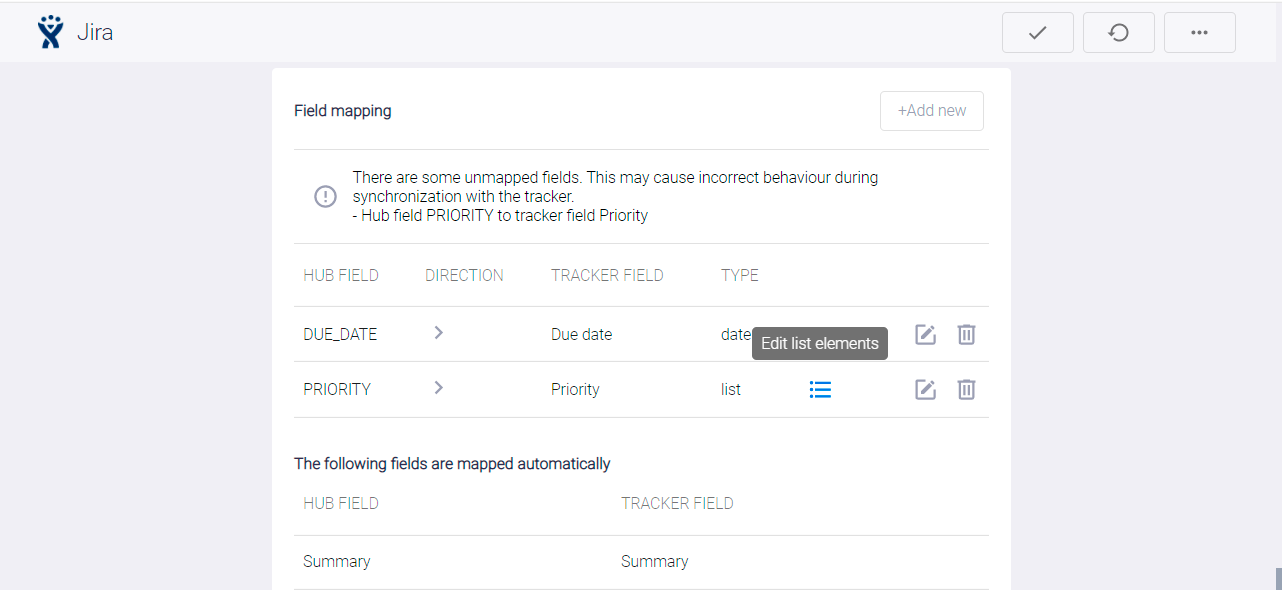 Однако, после создания этого правила сопоставления в секции Field mapping появилось предупреждение о существовании несопоставленных полей и возможном некорректном поведении при синхронизации с Jira. Списки приоритетов дефектов в AppSec.Hub и в проекте Jira часто различаются, и соответствие значений приоритета необходимо сопоставлять отдельно для каждого проекта. Кликните иконку Edit list elements