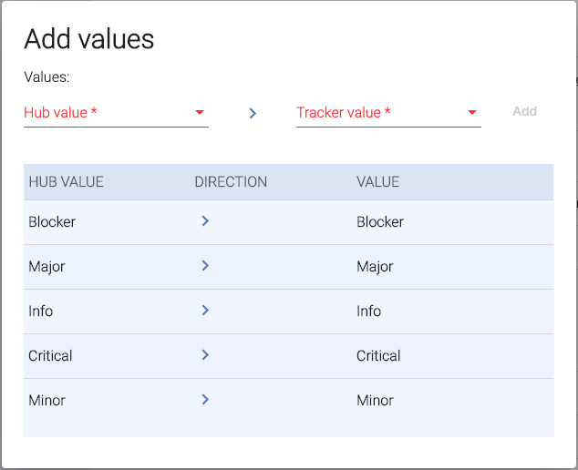 и сопоставьте попарно приоритеты дефектов AppSec.Hub с приоритетами дефектов Jira один за другим с помощью выпадающих списков в окне Add values. Нажмите кнопку Add для каждой пары сопоставленных приоритетов.