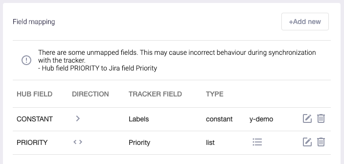 Например, для проекта в Jira требуется определение приоритета дефекта. В этом случае необходимо сопоставить приоритет дефектов в AppSec.Hub с приоритетом дефектов в Jira. Нажмите кнопку +Add new и выберите значение Priority [list] в выпадающем меню Hub field, значение Priority [list] в выпадающем меню Tracker field и нажмите кнопку Add. В результате создастся новое правило сопоставления полей, которое отображается в разделе Field mapping.