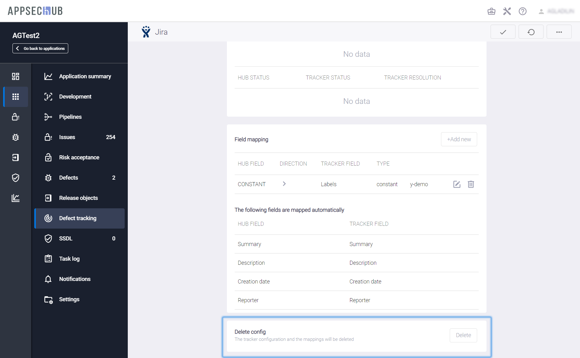 Таким образом было задано новое правило сопоставления полей между AppSec.Hub и Jira. Это правило отображается в разделе Field mapping на странице Defect Tracking.