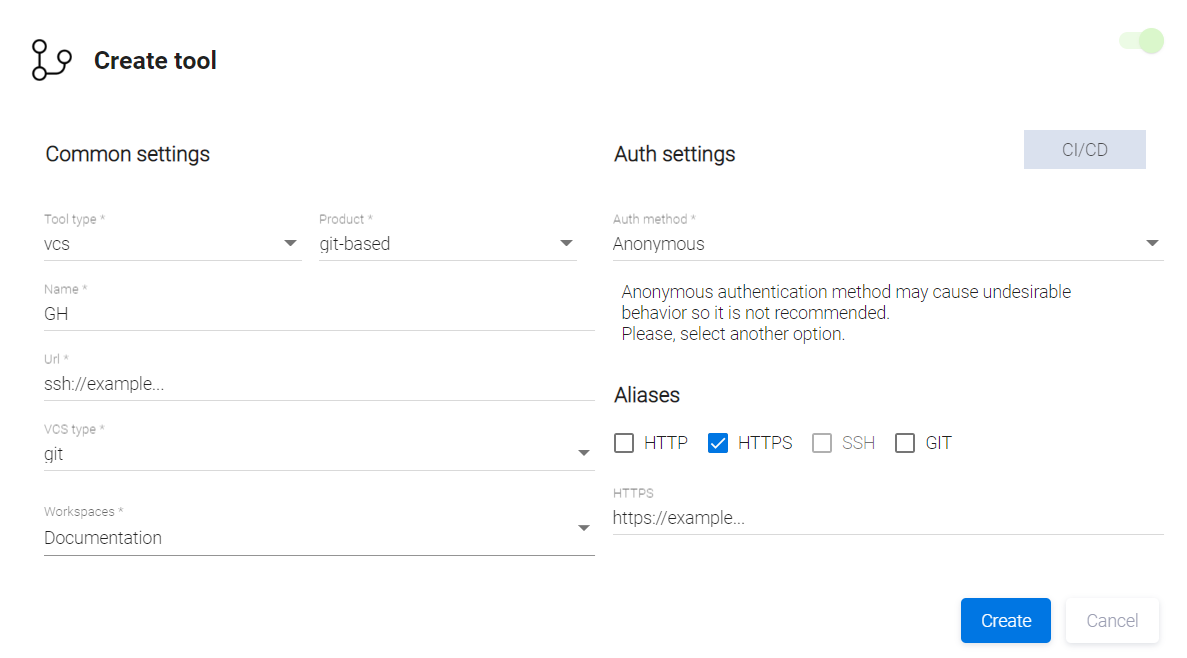 Алиасы (псевдонимы домена) используются для задания двух или более доменных имён одному и тому же сайту. В системе можно задать для инструмента от одного до четырех алиасов, а для инструмента JFrog Artifactory существует еще один дополнительный алиас. Каждый инструмент имеет свой URL. Для доступа к инструменту могут применяться разные протоколы, такие как HTTP, HTTPS, SSH, GIT. При работе с инструментами в окне Create tool или в окне Update tool в разделе Aliases можно выбрать соответствующие протоколы и при необходимости отредактировать предложенные системой доменные имена.