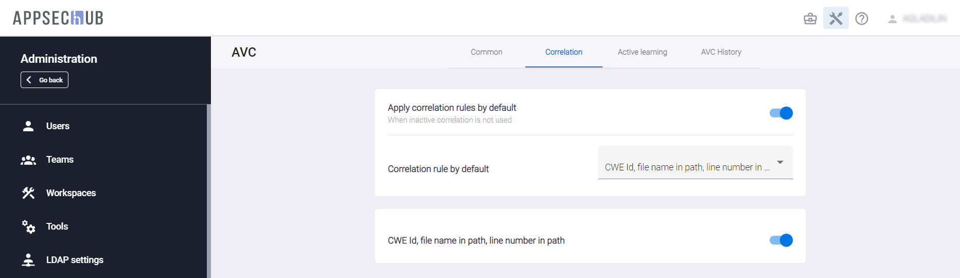 Выберите пункт меню AVC (Application Vulnerabilities Correlation) в меню слева, чтобы обновить настройки корреляции уязвимостей приложения (AVC). Страница AVC содержит четыре вкладки: Common, Correlation, Active learning и AVC History.