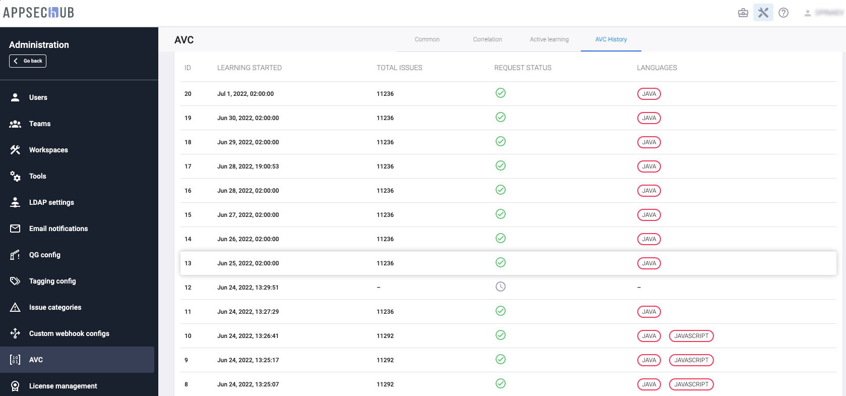 Вкладка AVC History содержит историю изменений настроек AVC-модели с точки зрения обучения (active learning) этой модели. Период тренировки AVC-модели задается в конфигурационном файле app.properties (см. раздел «Приложение 4. Конфигурационный файл app.properties»). По умолчанию, период переобучения составляет одни сутки.