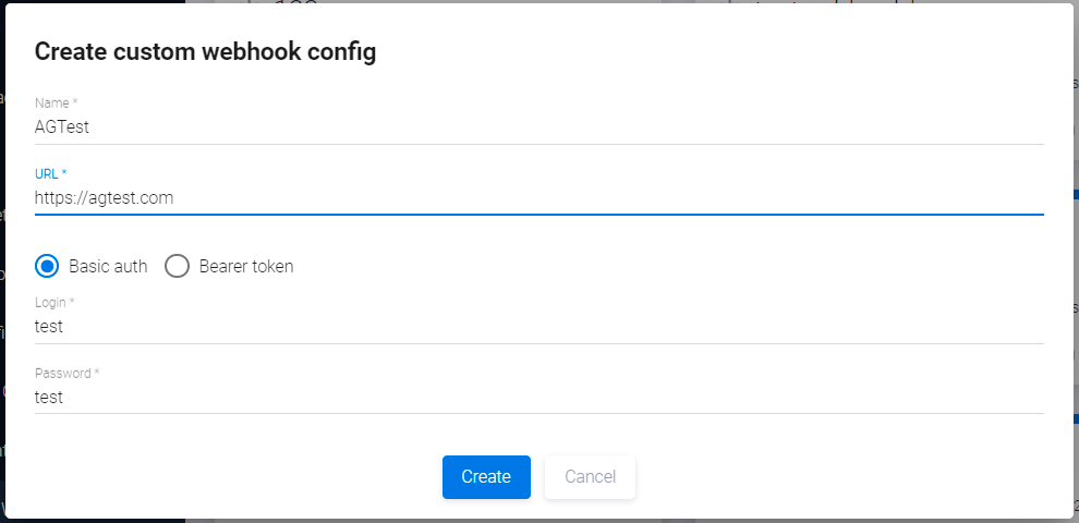 В появившемся диалоговом окне в поле Name укажите название конфигурации, в поле URL — адрес, на который будут передаваться соответствующие данные, а также выберите способ авторизации: с использованием Login/Password или с помощью токена.