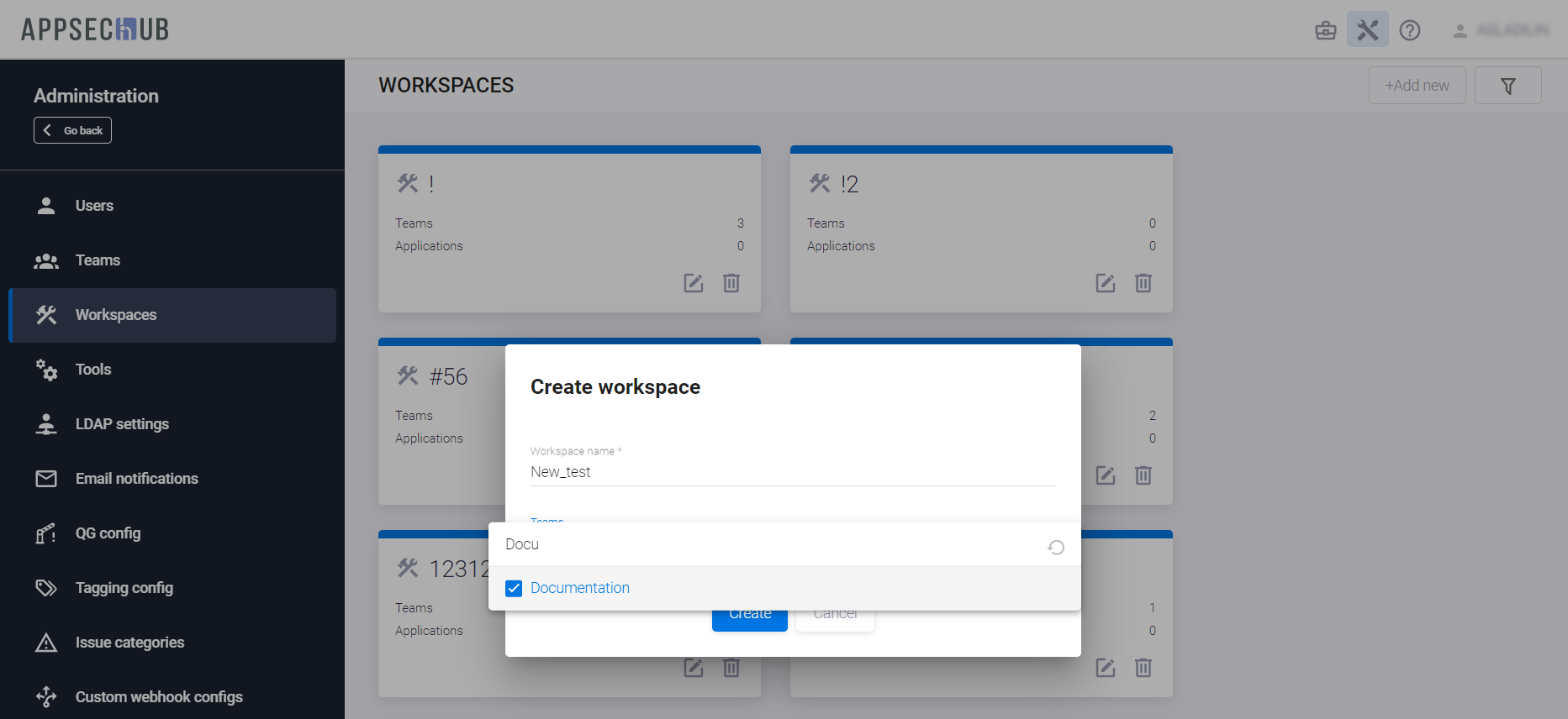Для создания нового рабочего пространства нажмите кнопку +Add new. В появившемся диалоговом окне Create workspace укажите наименование создаваемого рабочего пространства и выберите команды, которые смогут работать в этом рабочем пространстве.