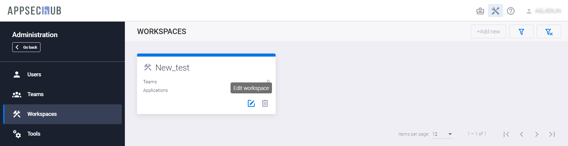 Для создания и настройки рабочих пространств предназначен пункт меню Workspaces в консоли слева. В самом начале работы с AppSec.Hub существует только одно предустановленное рабочее пространство — Default workspace. Все остальные рабочие пространства должны создаваться пользователем с правами Администратора.