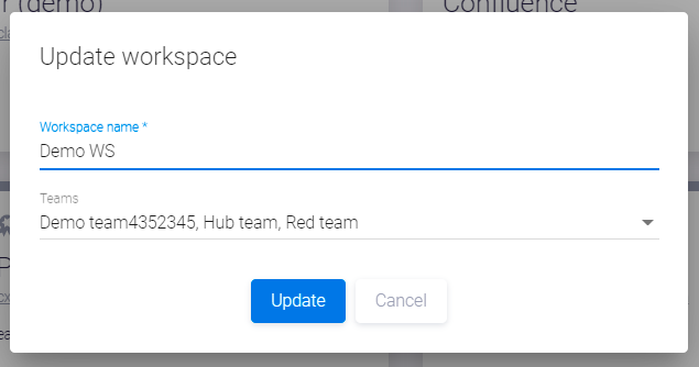 в правом верхнем углу страницы рабочего пространства. В появившемся окне Update workspace можно отредактировать имя рабочего пространства и привязать к нему команды, выбрав их из раскрывающегося списка. Для сохранения изменений нажмите кнопку Update внизу окна.