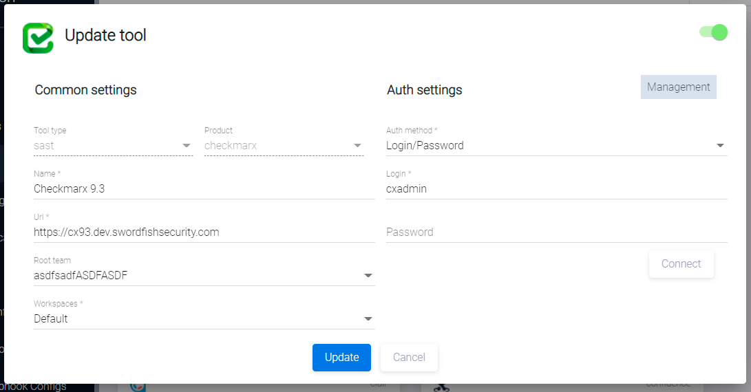в правом нижнем углу карточки, чтобы обновить список привязанных к нему рабочих пространств. На экране появится окно Update tool.
