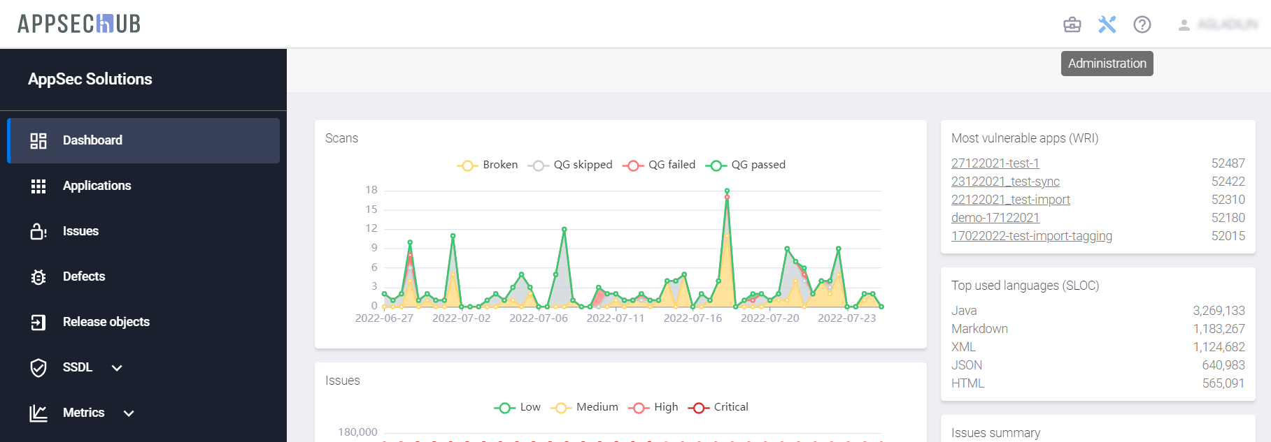 , расположенную в правом верхнем углу пользовательского интерфейса AppSec.Hub, перейдите на страницу администрирования системы.