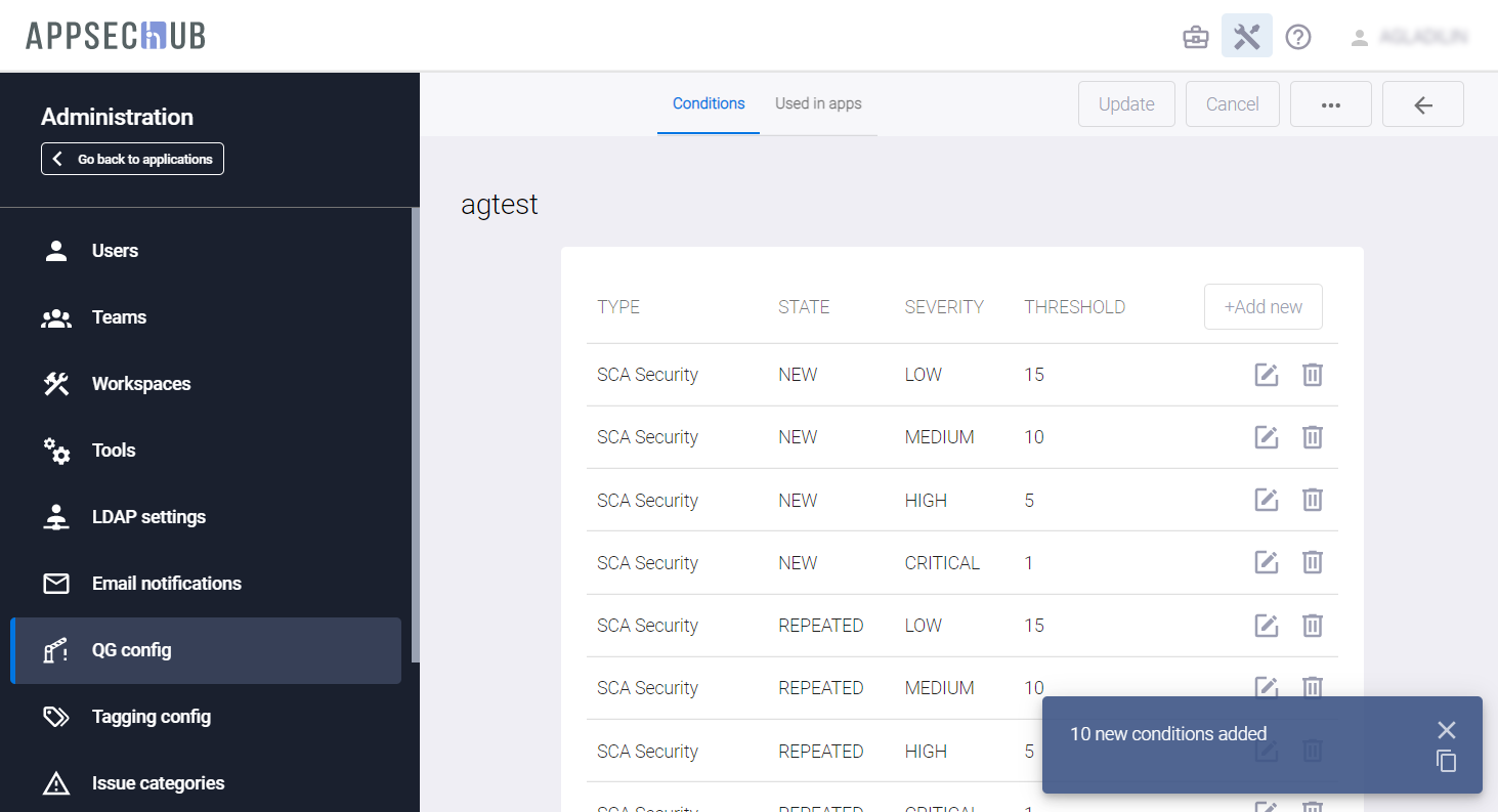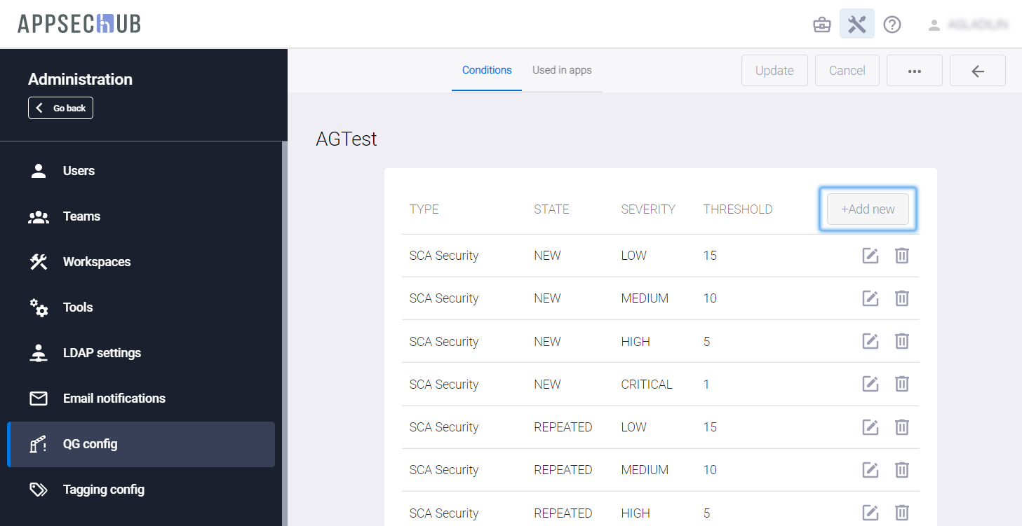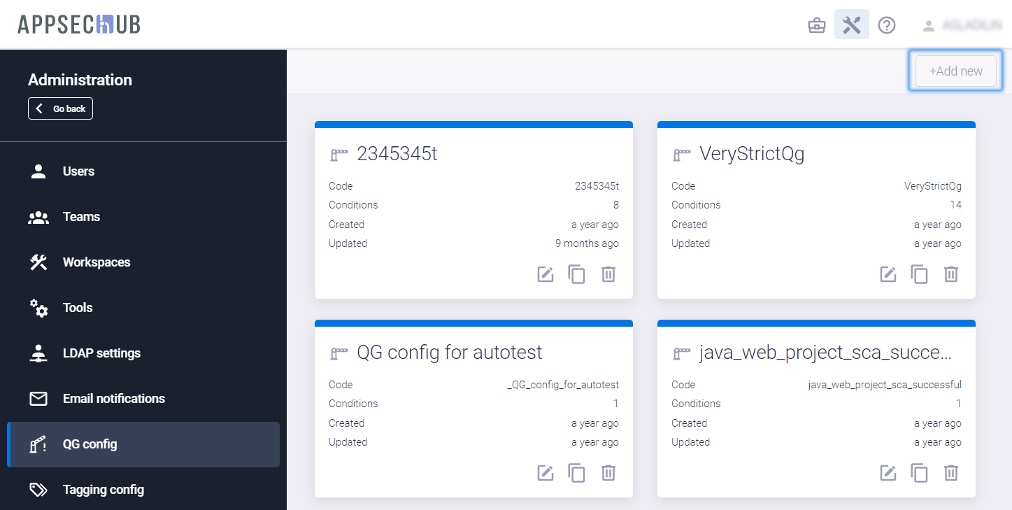 Для добавления в Quality Gate условий перейдите на страницу настройки профиля Quality Gate (см. раздел «Настройка профиля Quality Gate» и нажмите кнопку +Add new.