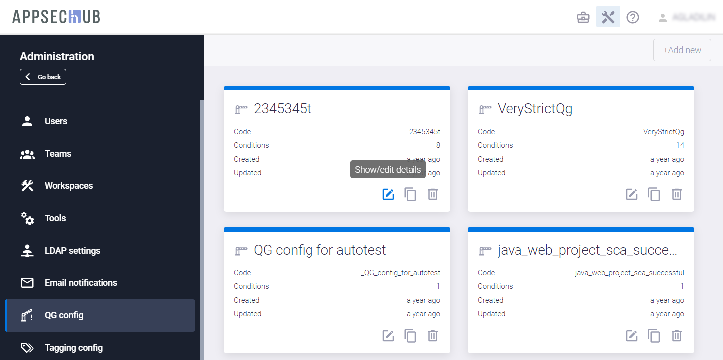 Чтобы перейти к настройке профиля Quality Gate, нажмите иконку Show/edit details в правом нижнем углу его карточки. Более подробная информация о создании профиля Quality Gates приведена выше в разделе «Создание профиля Quality Gate».