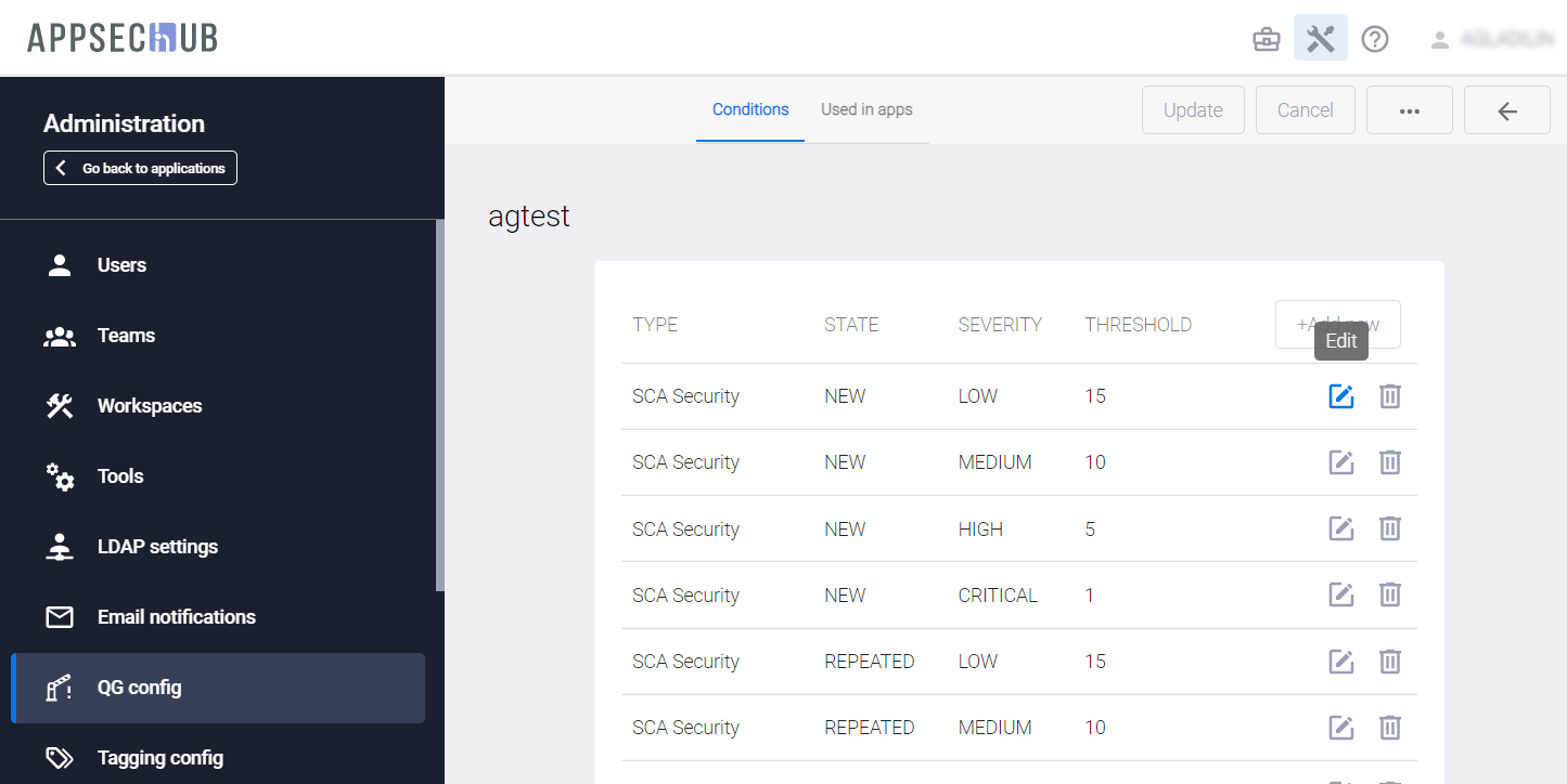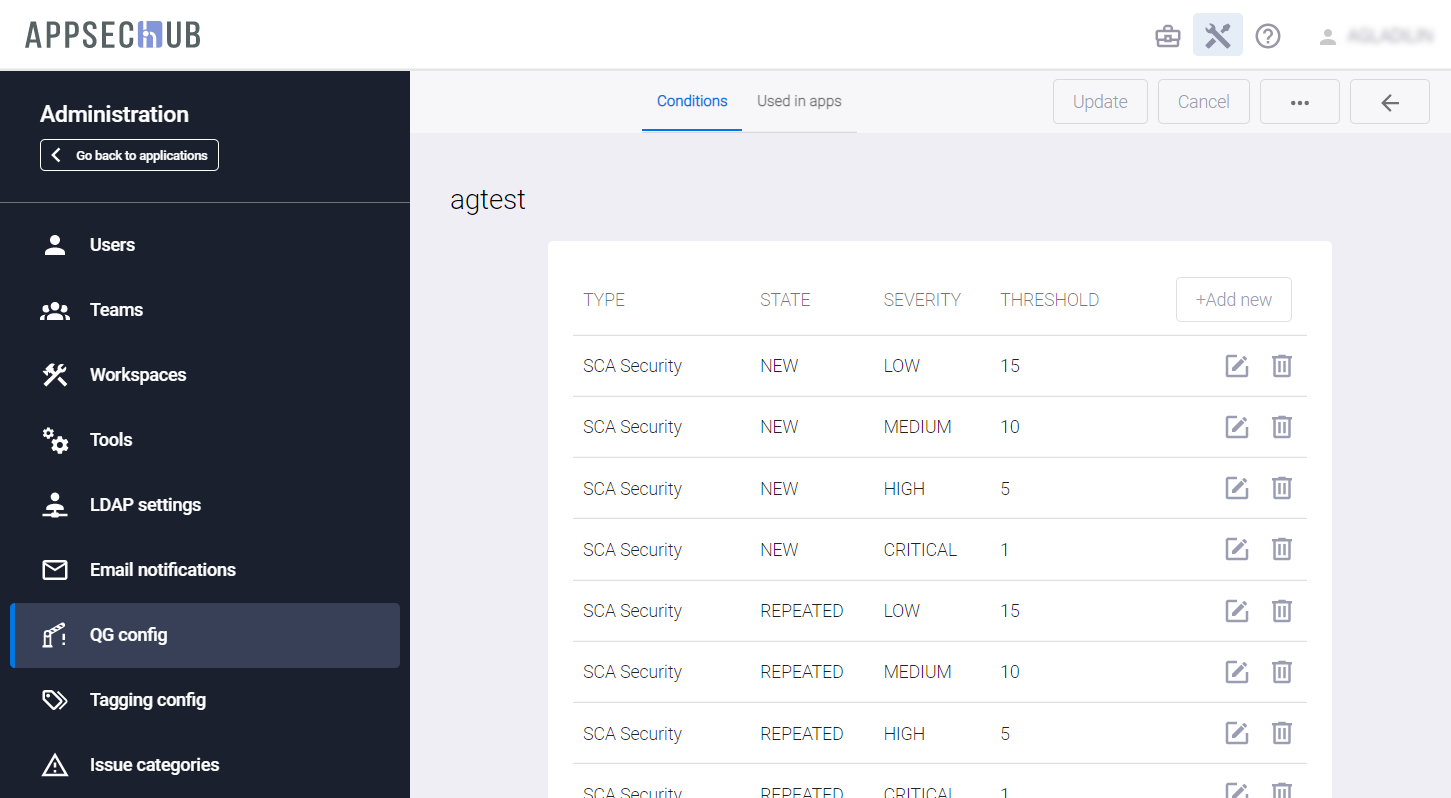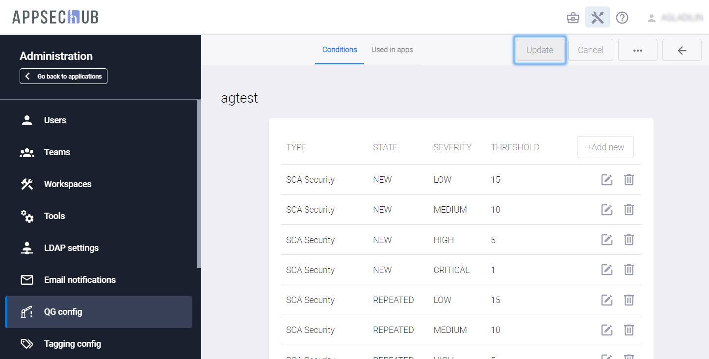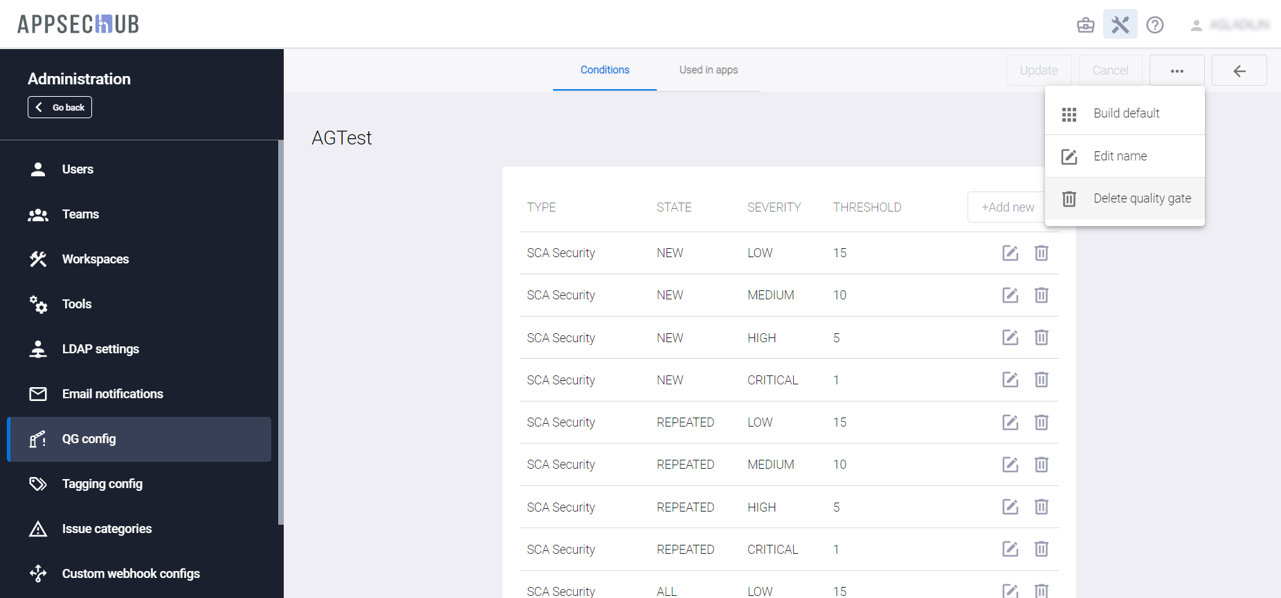 В AppSec.Hub реализовано централизованное управление Quality Gates. На панели администрирования создается определяющий основные критерии конфигурационный профиль Quality Gate, который в дальнейшем может включаться в различные Security Pipelines приложений. Благодаря системному подходу изменение условий профиля приводит к автоматическому и одновременному изменению критериев во всех Security Pipelines, в которых используется данный Quality Gate.