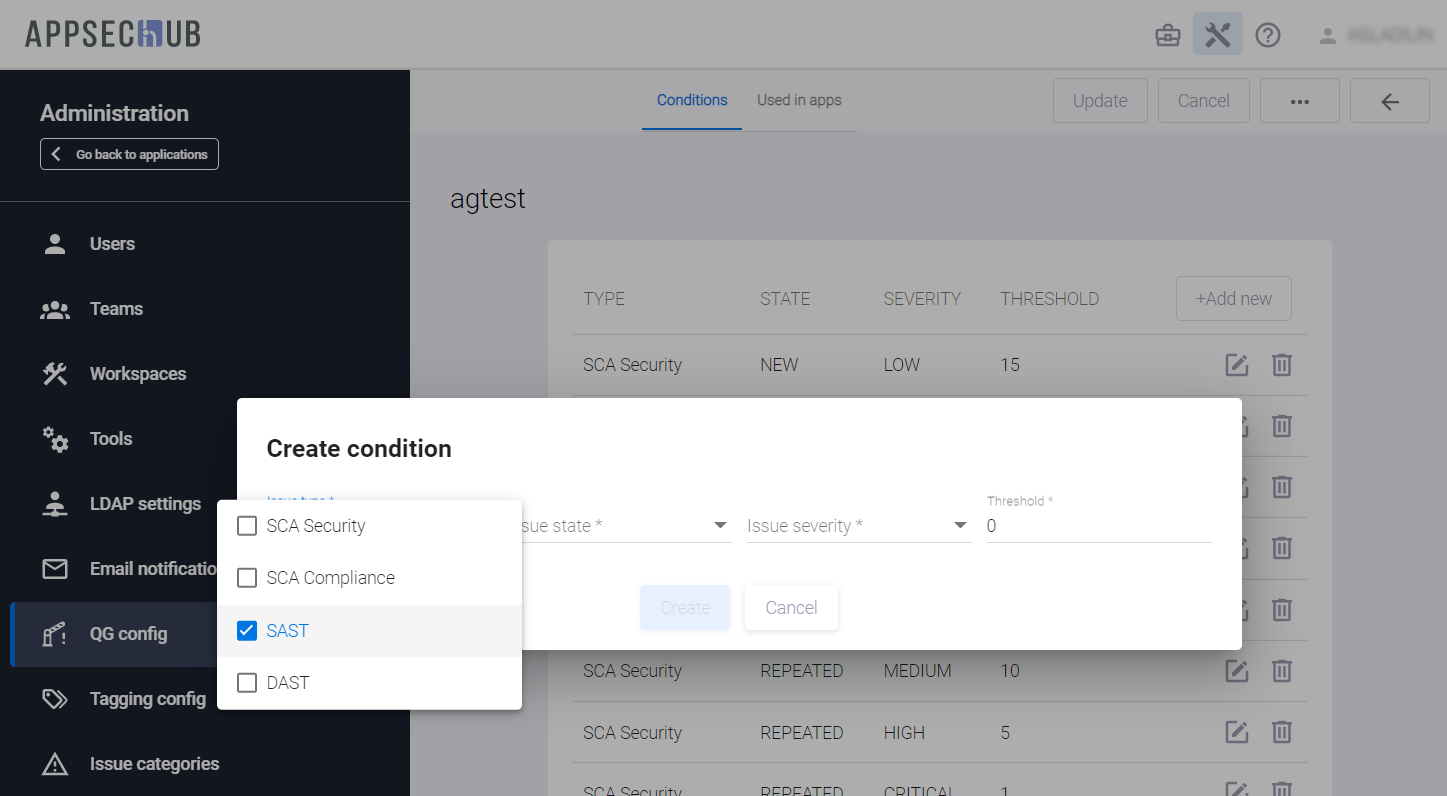 В появившемся диалогом окне в поле Issue type укажите практики AST, для которых определяются условия.