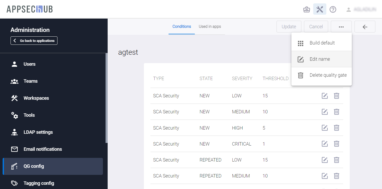 Чтобы отредактировать название Quality Gate, нажмите кнопку Actions