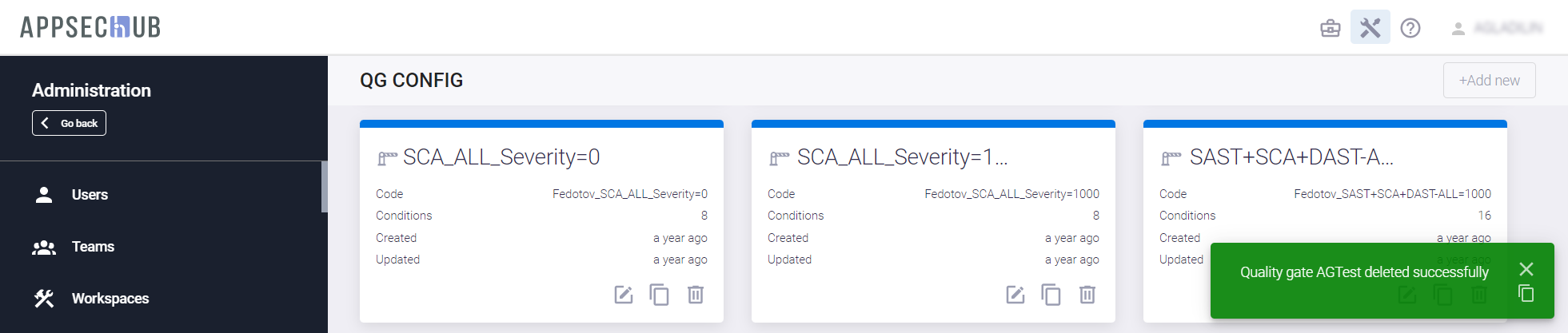 Чтобы удалить профиль Quality Gate, перейдите на страницу QG Config, см. раздел «Создание профиля Quality Gate». В правом нижнем углу карточки Quality Gate нажмите иконку Delete Quality Gate