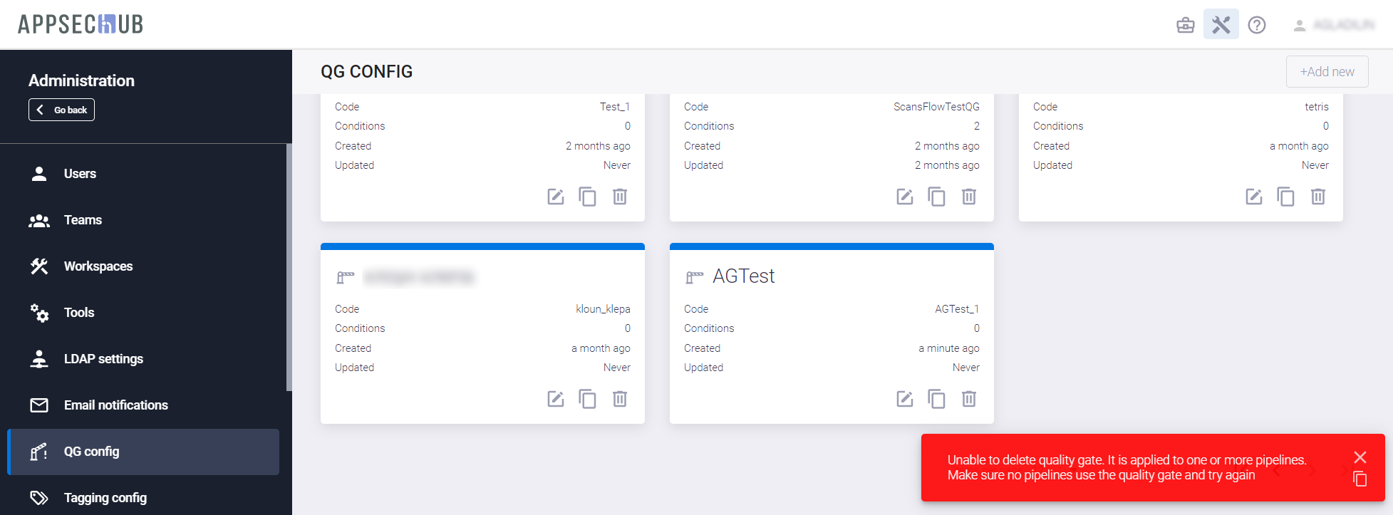 Если предпринимается попытка удаления Quality Gate, который используется в каких-либо Security Pipelines, в правом нижнем углу пользовательского интерфейса отображается соответствующее предупреждение.