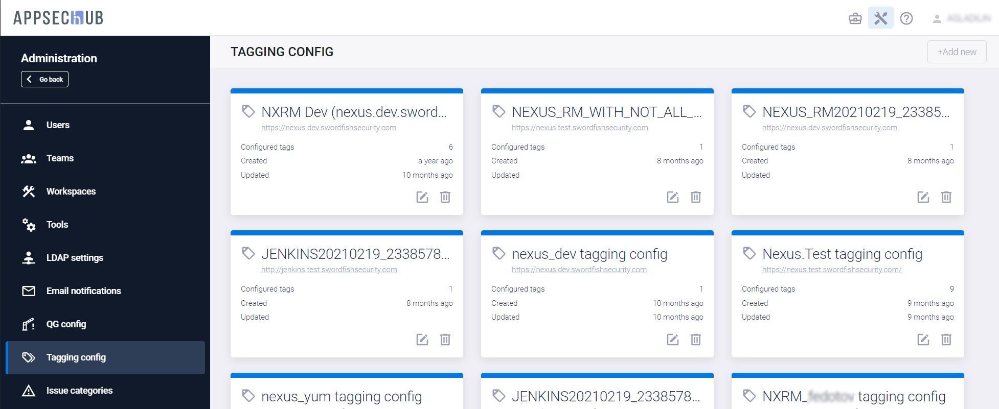 Если на этой странице еще не существует карточек конфигурации тегирования для нужного типа инструмента, нажмите кнопку +Add new в верхнем правом углу страницы Tagging Config, чтобы определить параметры тегирования. На экране появится окно Create tagging config.