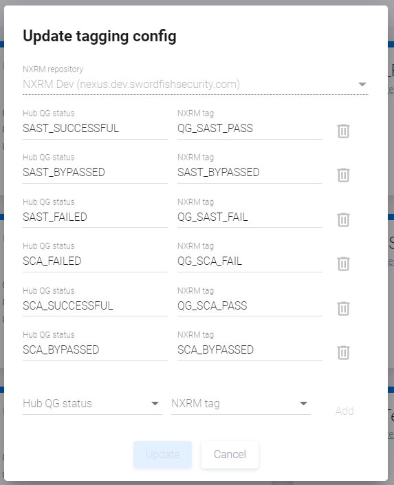 Выберите NXRM repository из выпадающего списка и во вновь появившихся полях Hub QG status и NXRM tag попарно сопоставьте статусы QG и теги репозитория. Чтобы сопоставить такую пару, кликните поле Hub QG status и выберите статус QG из выпадающего списка. Затем кликните поле NXRM tag и выберите тег репозитория из выпадающего списка.