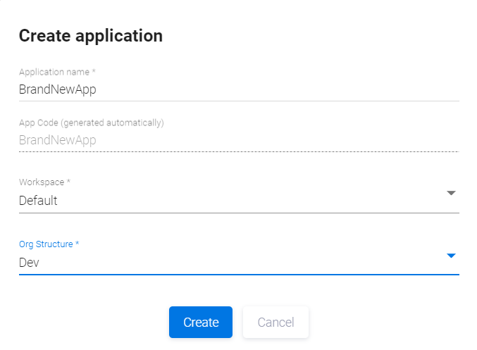 Определите имя нового приложения, рабочее пространство и подразделение организационной структуры для приложения в появившемся окне Create application. Рабочее пространство и подразделение для приложения можно выбрать из списков рабочих пространств и подразделений, доступных для команды (команд) Менеджера. У Администратора есть возможность в случае необходимости назначить Менеджера на работу с большим количеством команд. Таким образом, для вновь создаваемого приложения будет доступно больше рабочих пространств.