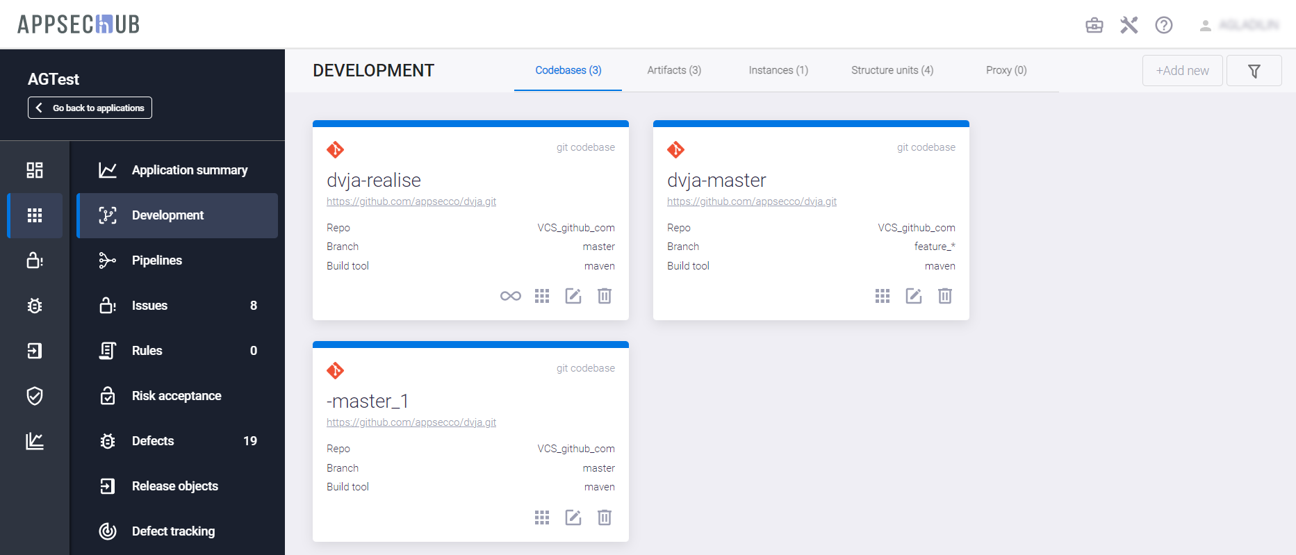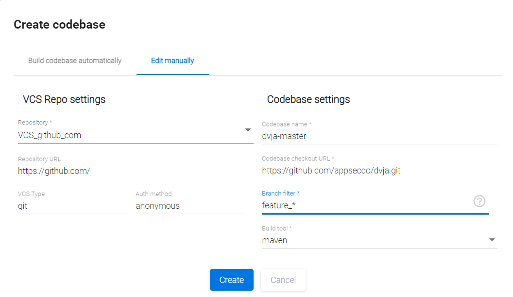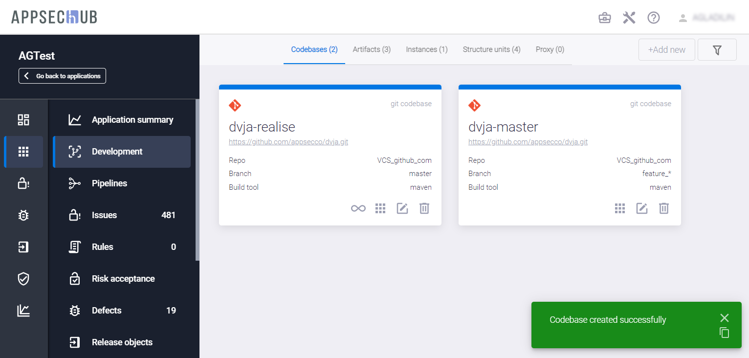 Нажмите кнопку Create, чтобы создать новую кодовую базу в AppSec.Hub.