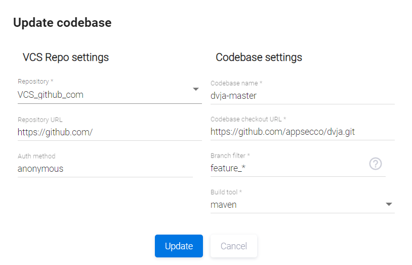 Измените параметры кодовой базы, как описано выше, и нажмите кнопку Update.