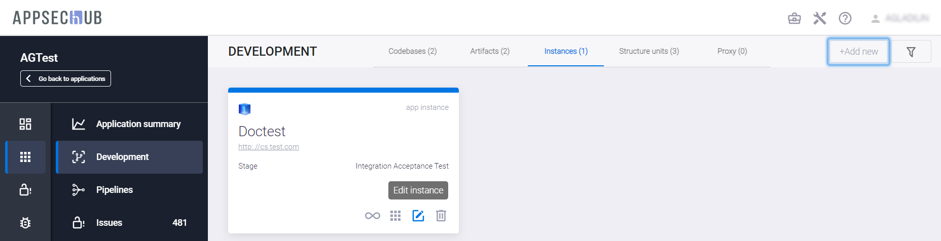 Выберите пункт меню Development слева, а затем нажмите кнопку +Add new в правом верхнем углу вкладки Instances, чтобы добавить новый экземпляр приложения, или иконку редактирования