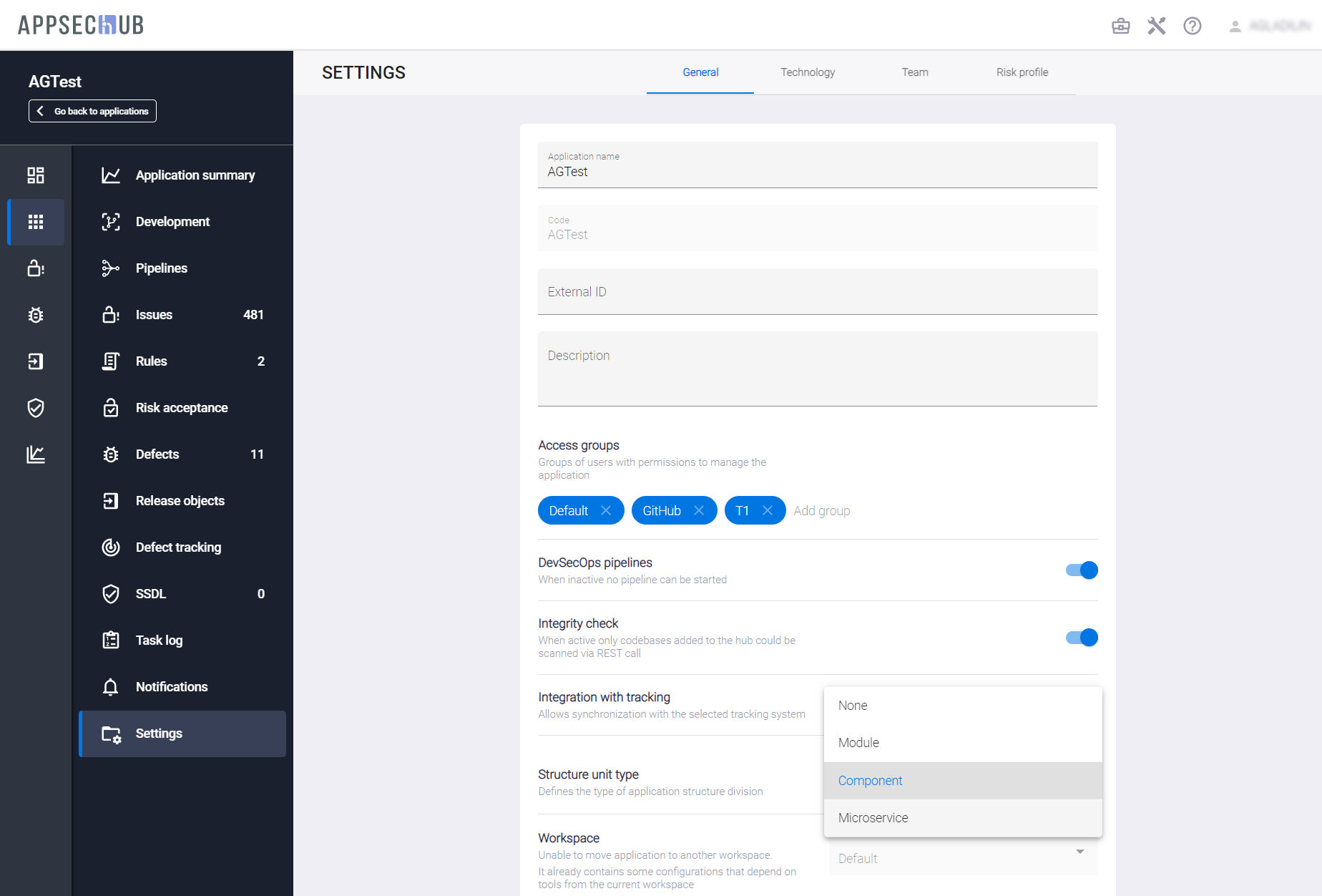 Возможность определения типа структурной единицы позволяет настроить работу с приложением в AppSec.Hub под структуру приложения (модули, компоненты или микросервисы). Например, если приложение имеет микросервисную архитектуру, целесообразно выбрать Microservice в разделе Structure unit type на вкладке General.