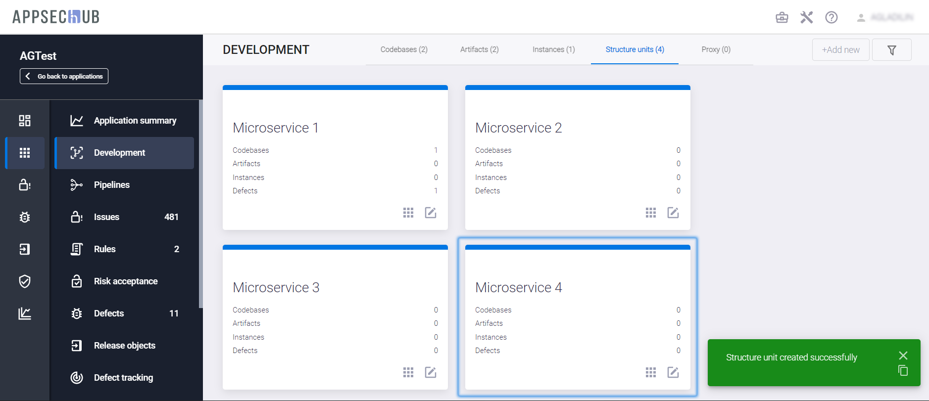 Каждая из этих структурных единиц имеет свои собственные кодовые базы, артефакты, экземпляры и дефекты. Каждая карточка структурной единицы отображает их количество, относящееся к этой структурной единице. Нажмите иконку Edit unit