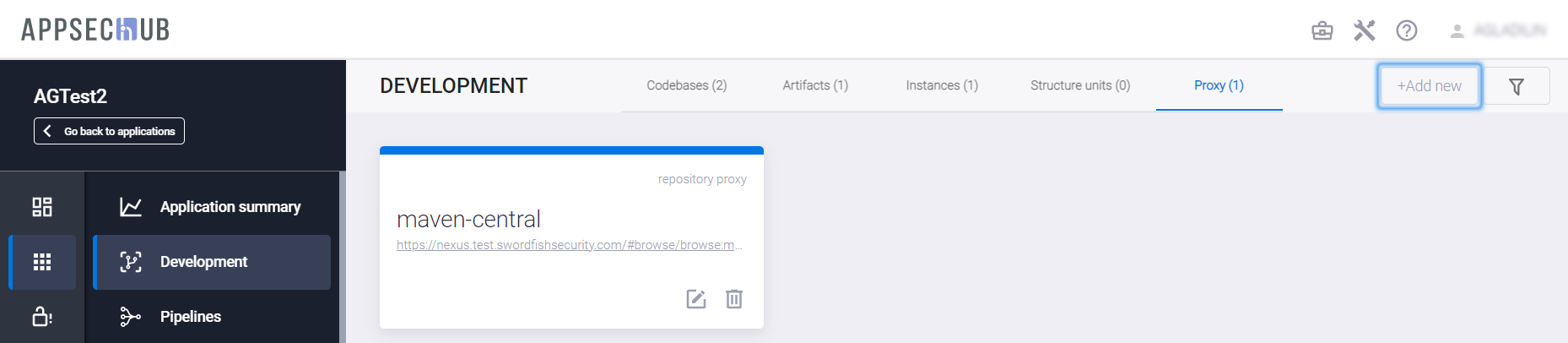 Выбрав слева пункт меню Development, перейдите на вкладку Proxy. На данной вкладке отображаются прокси-репозитории. Чтобы создать новый прокси-репозиторий, нажмите кнопку +Add new.