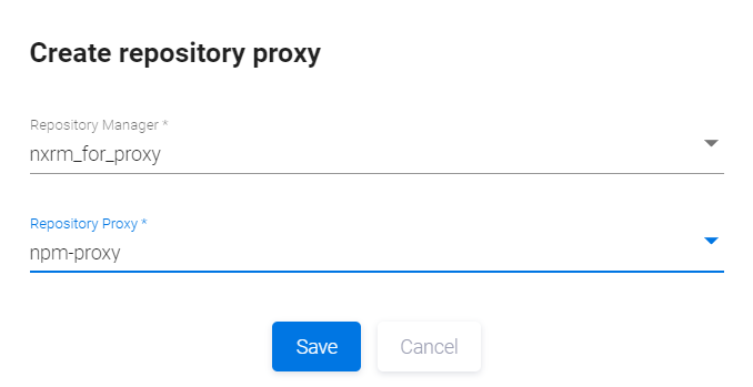 Появится диалоговое окно Create repository proxy. В поле Repository Manager выберите менеджер репозиториев, а в поле Repository proxy — необходимый репозиторий. После заполнения обеих полей, нажмите кнопку Save, чтобы создать прокси-репозиторий, или Cancel, чтобы отменить.
