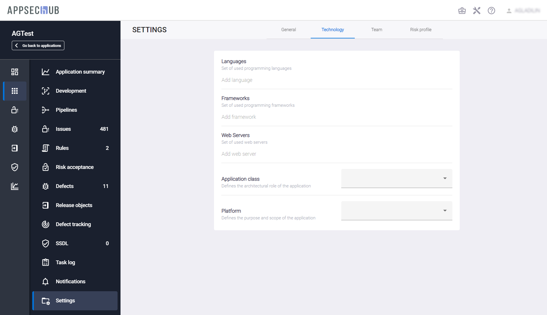 Информация, размещенная на этой вкладке, не является обязательной для заполнения. Она описывает используемые приложением технологии и не влияет на поведение приложения в AppSec.Hub.