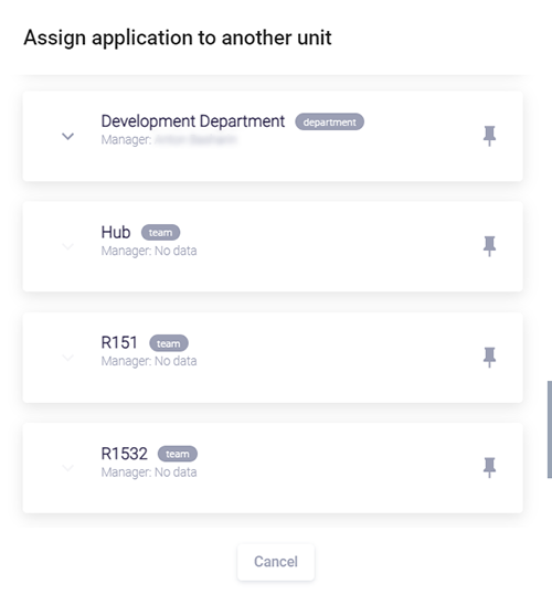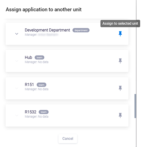 Обновите организационную структуру приложения, нажав кнопку Change справа. На экране появится окно Assign application to another unit.