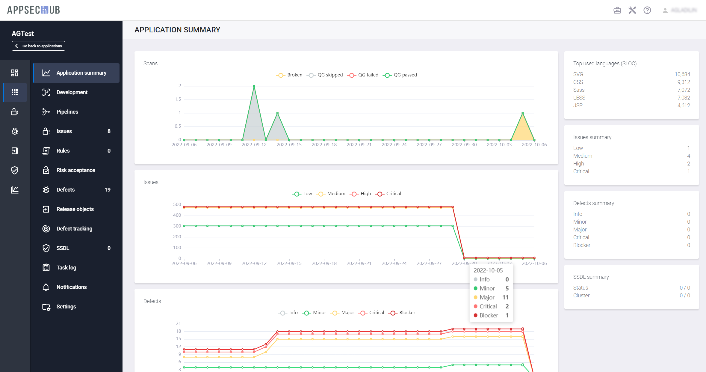 - Application summary — информация о приложении. На данной странице отображается текущий статус приложения с точки зрения метрик сканирования, проблем и дефектов безопасности, см. рис. выше. Также на экран выведены размер кодовой базы приложения в SLOC сводка по проблемам безопасности, сводка по дефектам безопасности и сводка по SSDL. Все эти данные извлекаются из хранилища данных (data warehouse).