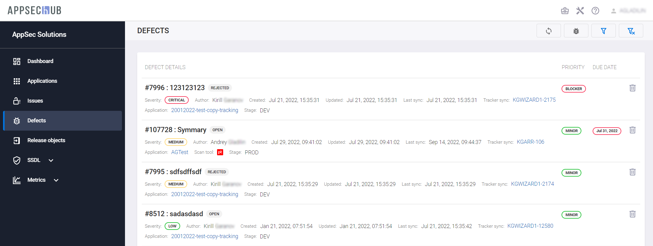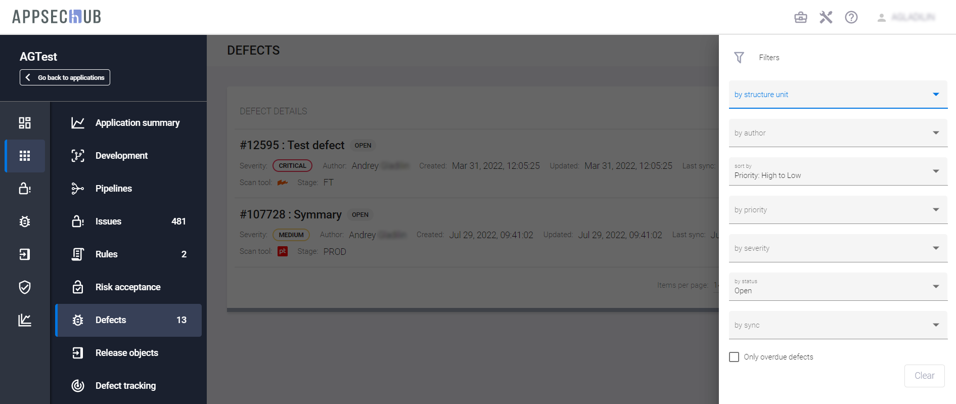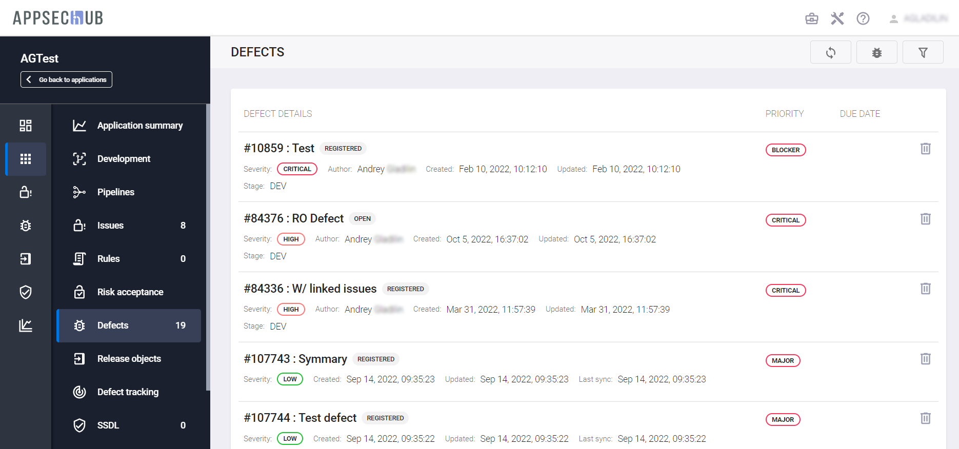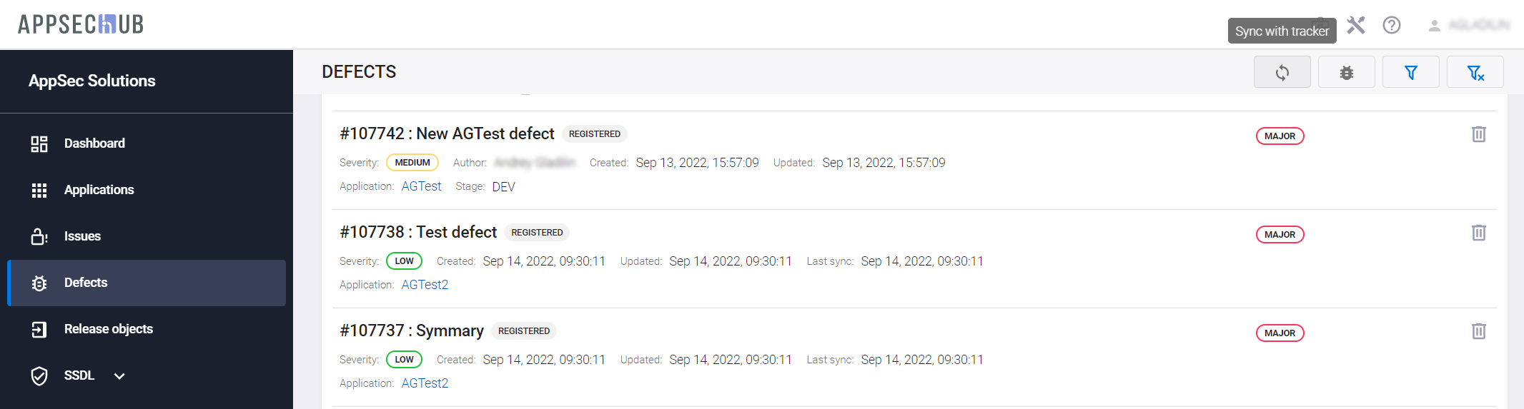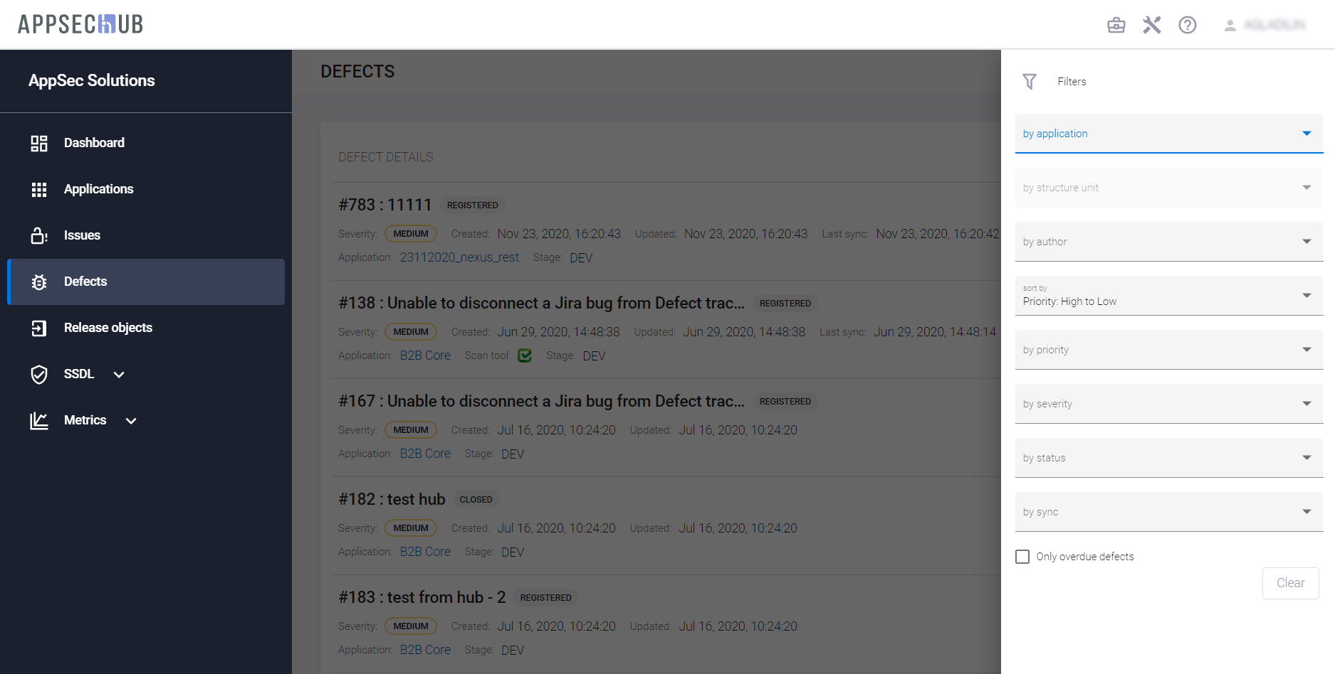 Чтобы синхронизировать дефекты для нескольких приложений, находясь на главном экране системы AppSec.Hub, выберите в меню пункт Defects.