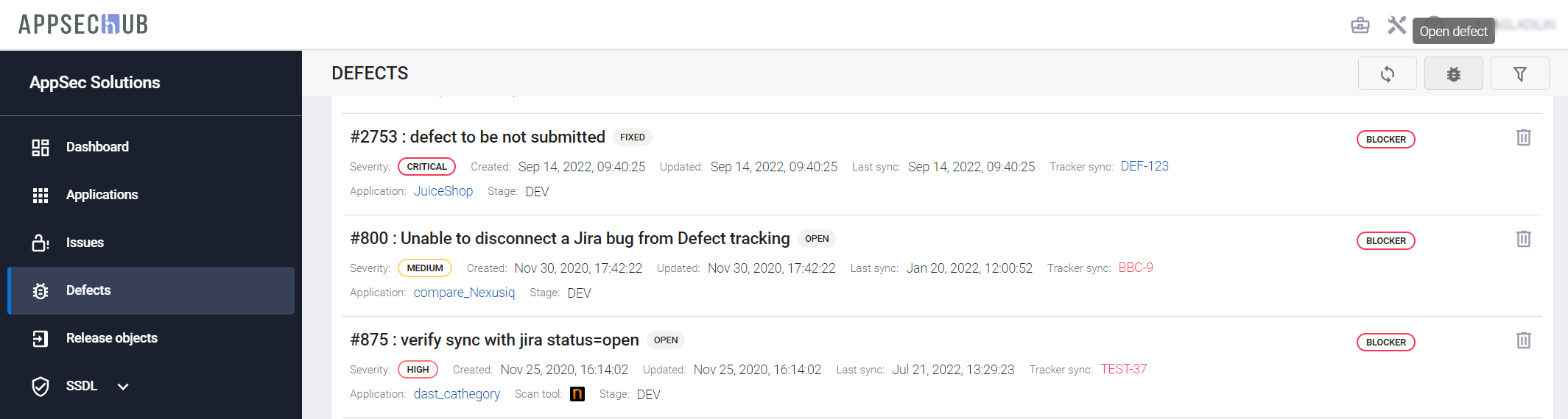 . В результате кнопка Open defect справа вверху станет активной и рядом с ней будет отображаться количество проблем безопасности, связанных с создаваемым дефектом.
