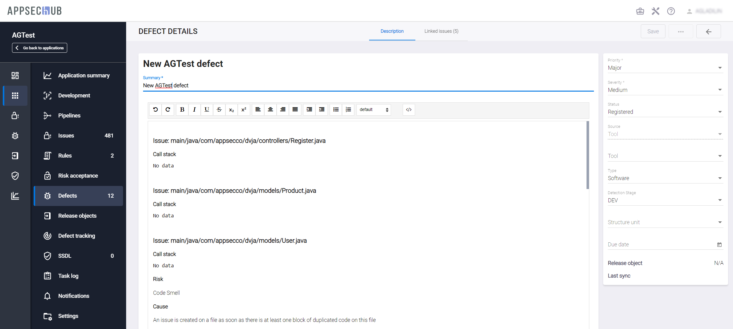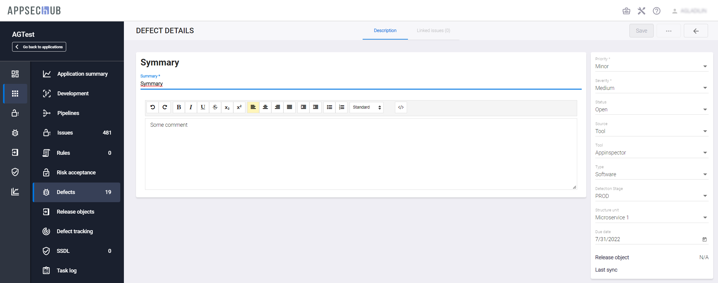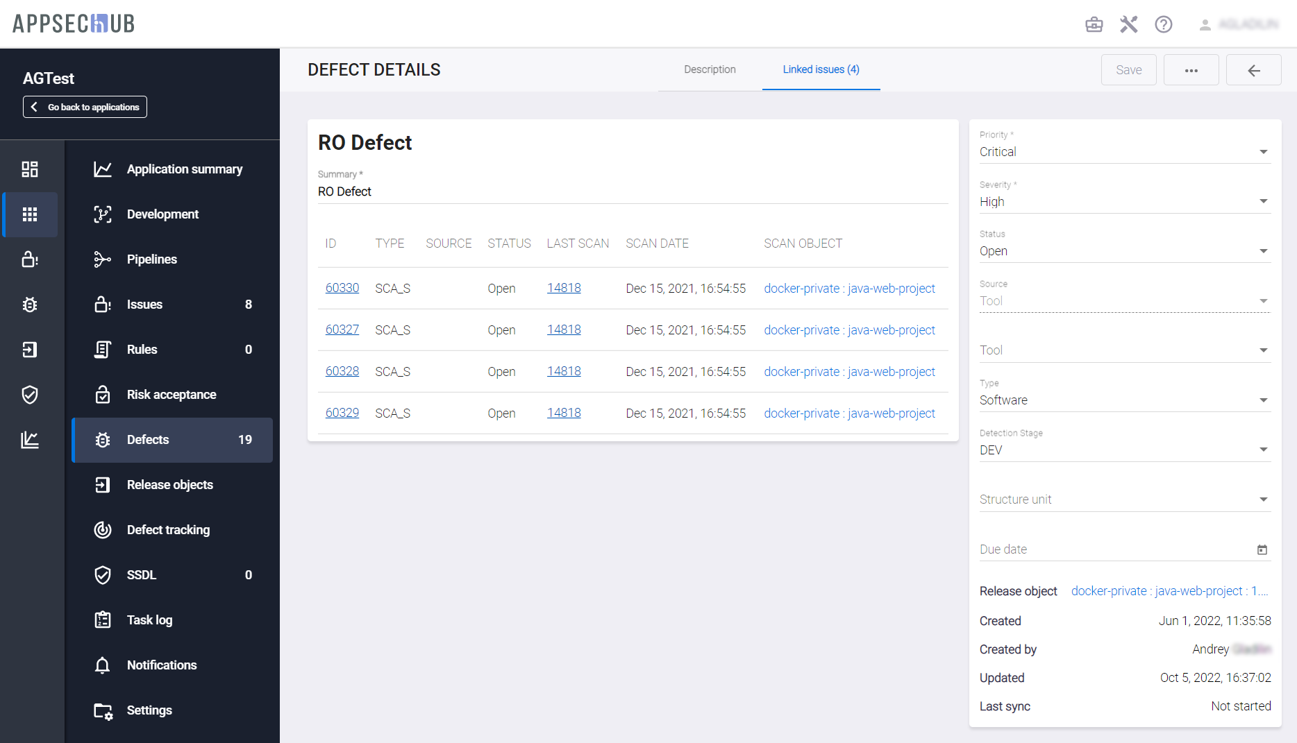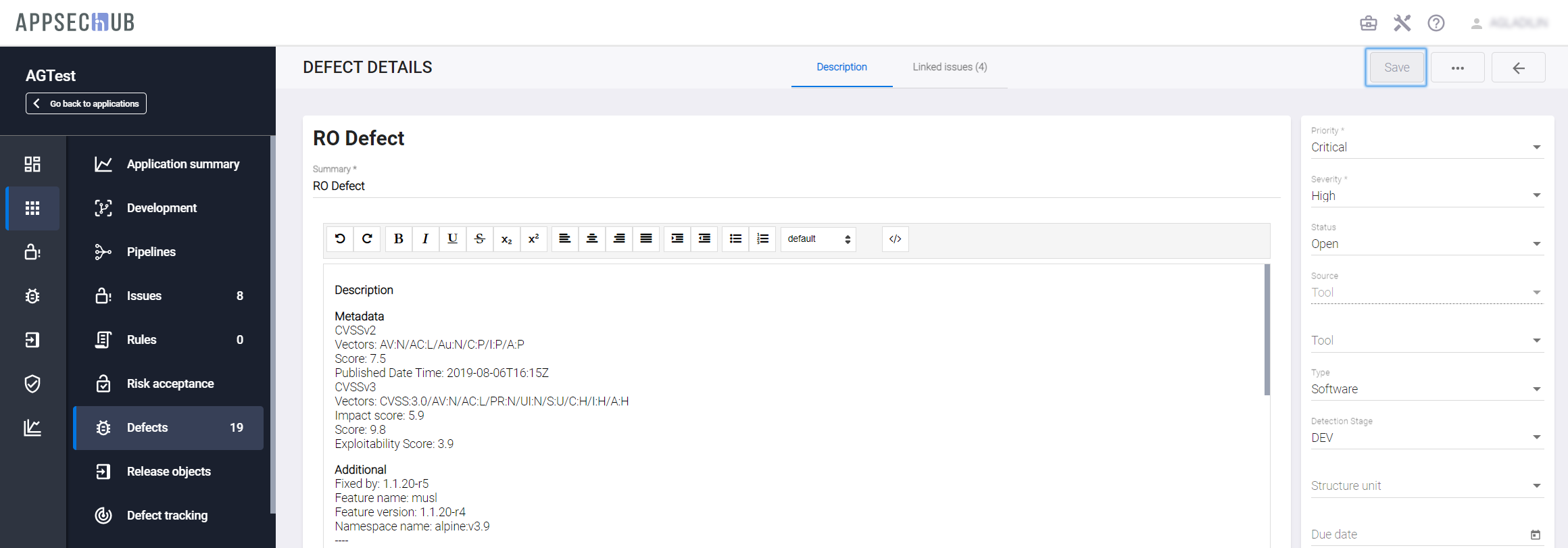 Нажмите на строку с дефектом безопасности на странице дефектов приложения, чтобы посмотреть детальную информацию о нем. На экране появится окно с двумя вкладками: Description и Linked issues. Для дефектов, которые создаются на основе проблем безопасности, обнаруженных в ходе сканирования, привязанного к релизному объекту, вкладка Description дополнительно содержит поле Release object со ссылкой на соответствующий релизный объект.